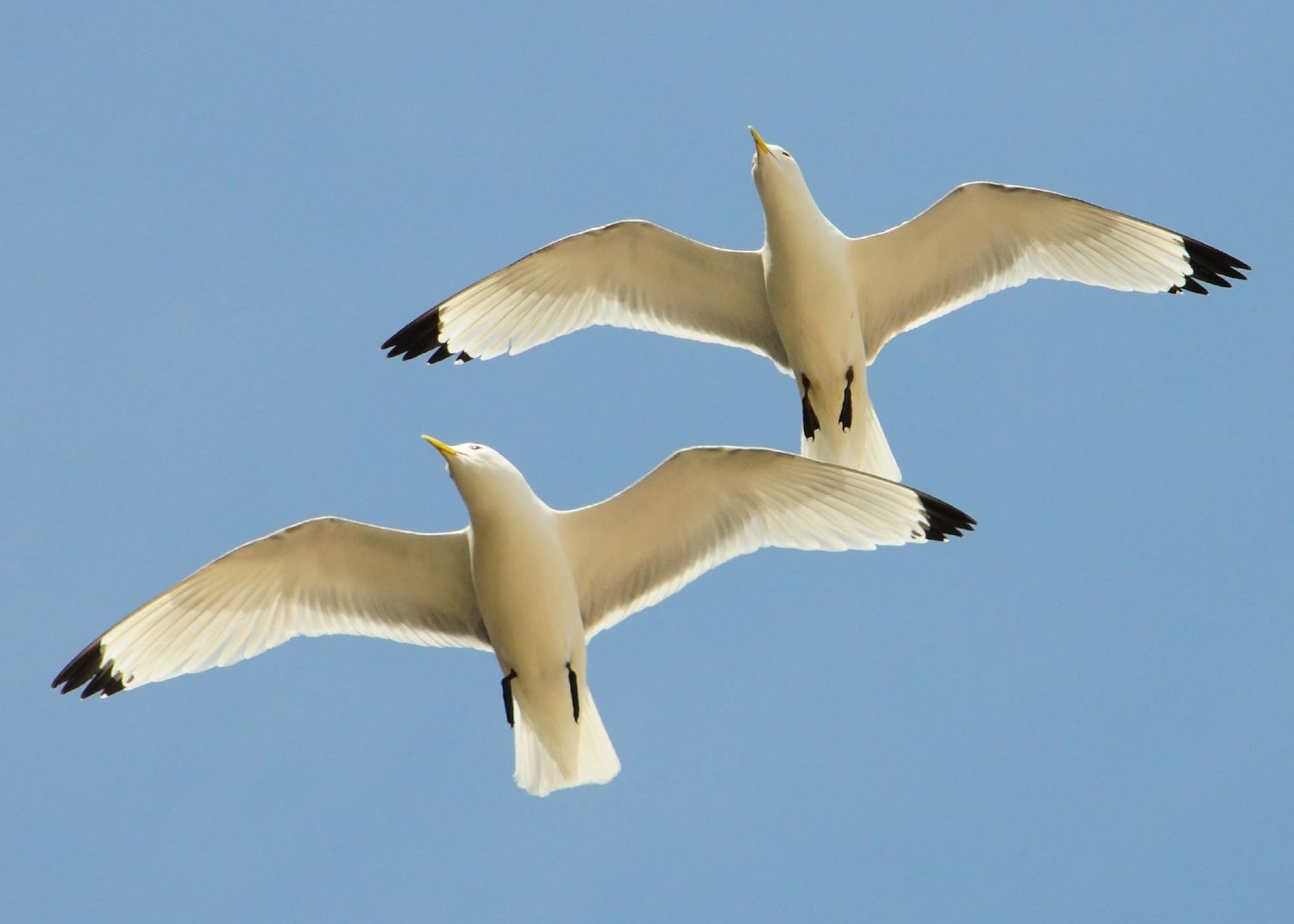 Often mistaken for a Common Gull, Kittiwakes are indeed part of the gull family but they have a few unique characteristics. Short black legs and black wingtips that look like they’ve been dipped in ink set them apart from their relatives. These birds are strictly coastal, rarely venturing inland and spend their summers on our clifftops and their winters out at sea.