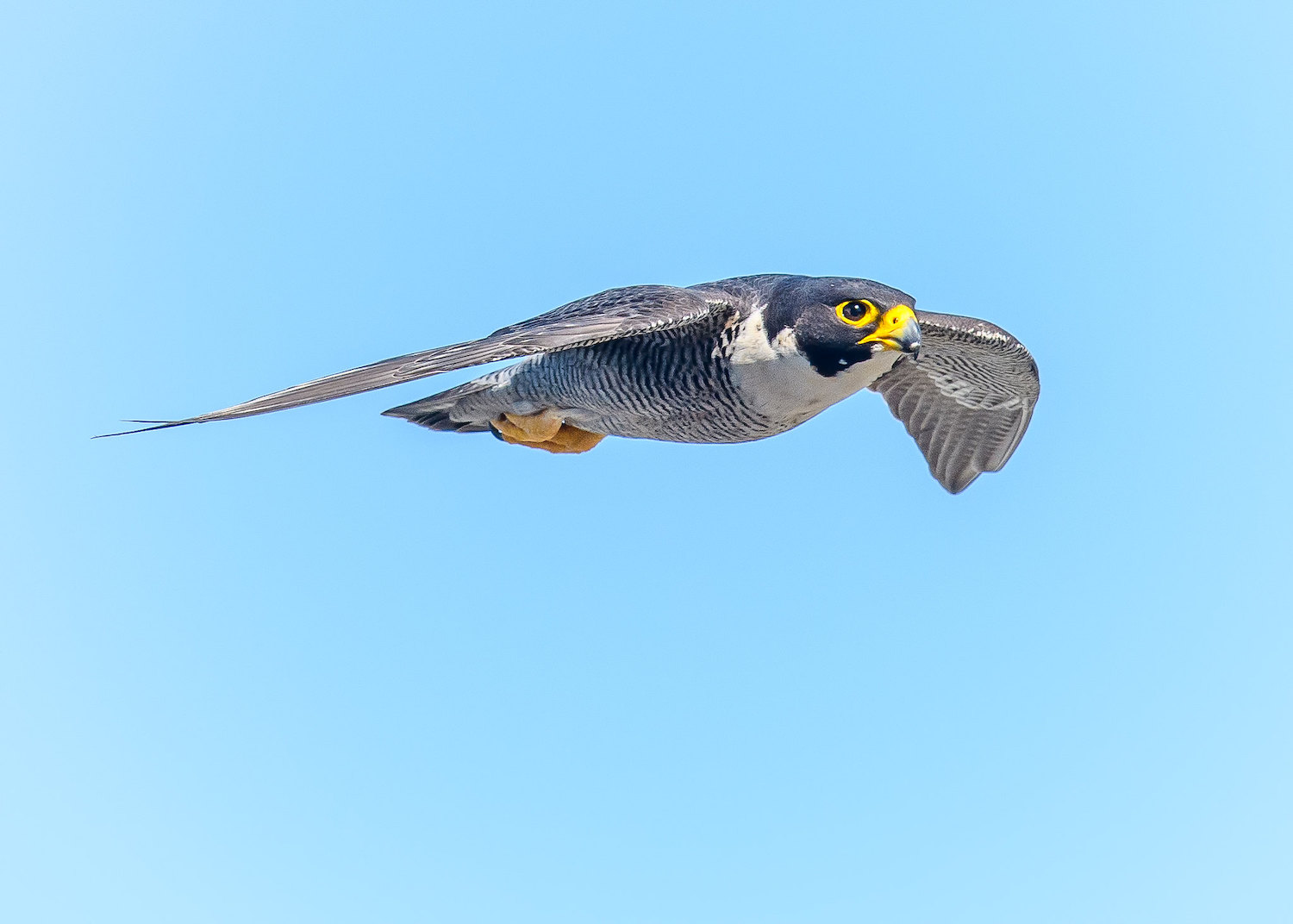 Preferring to nest on steep, rocky sea cliffs, Peregrine Falcons can often be spotted on a walk out to the rumps where conditions are perfect for these birds to make a home. Known for being the fastest animal on the planet, these birds will swoop down at prey at up to 200 miles per hour, snatching their target out of the air. Peregrine Falcons are identified by a strong moustache, a white neck and a striped black and white underside.