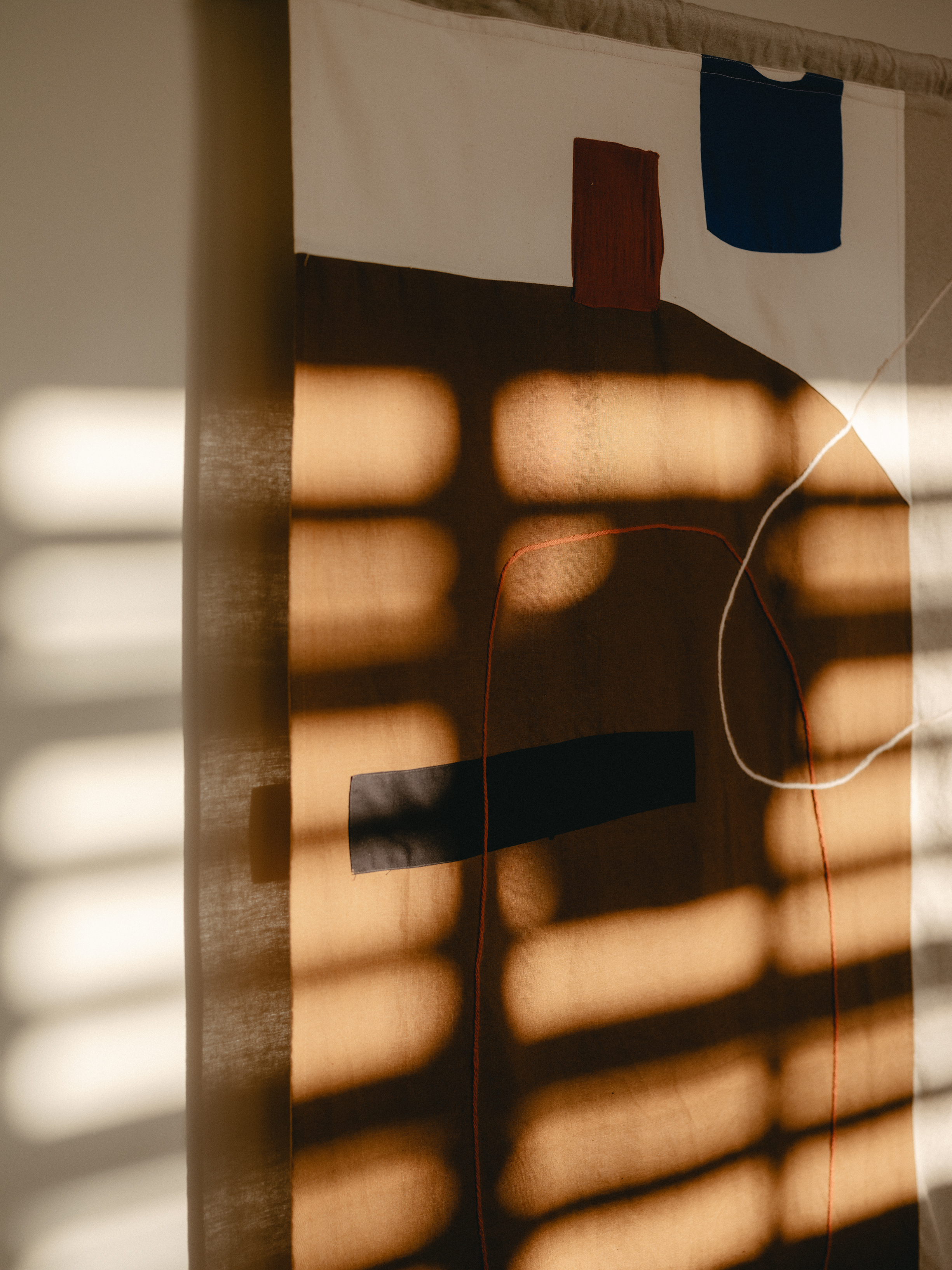 For those that have visited our Reception and yoga studio, will have seen the beautiful textiles hanging on the walls. In fact, many of you have been asking about them! We caught up with textile artist, Amy to hear all about growing up in Cornwall, her approach to fabric sourcing and an insight into how she designs these wonderful pieces.