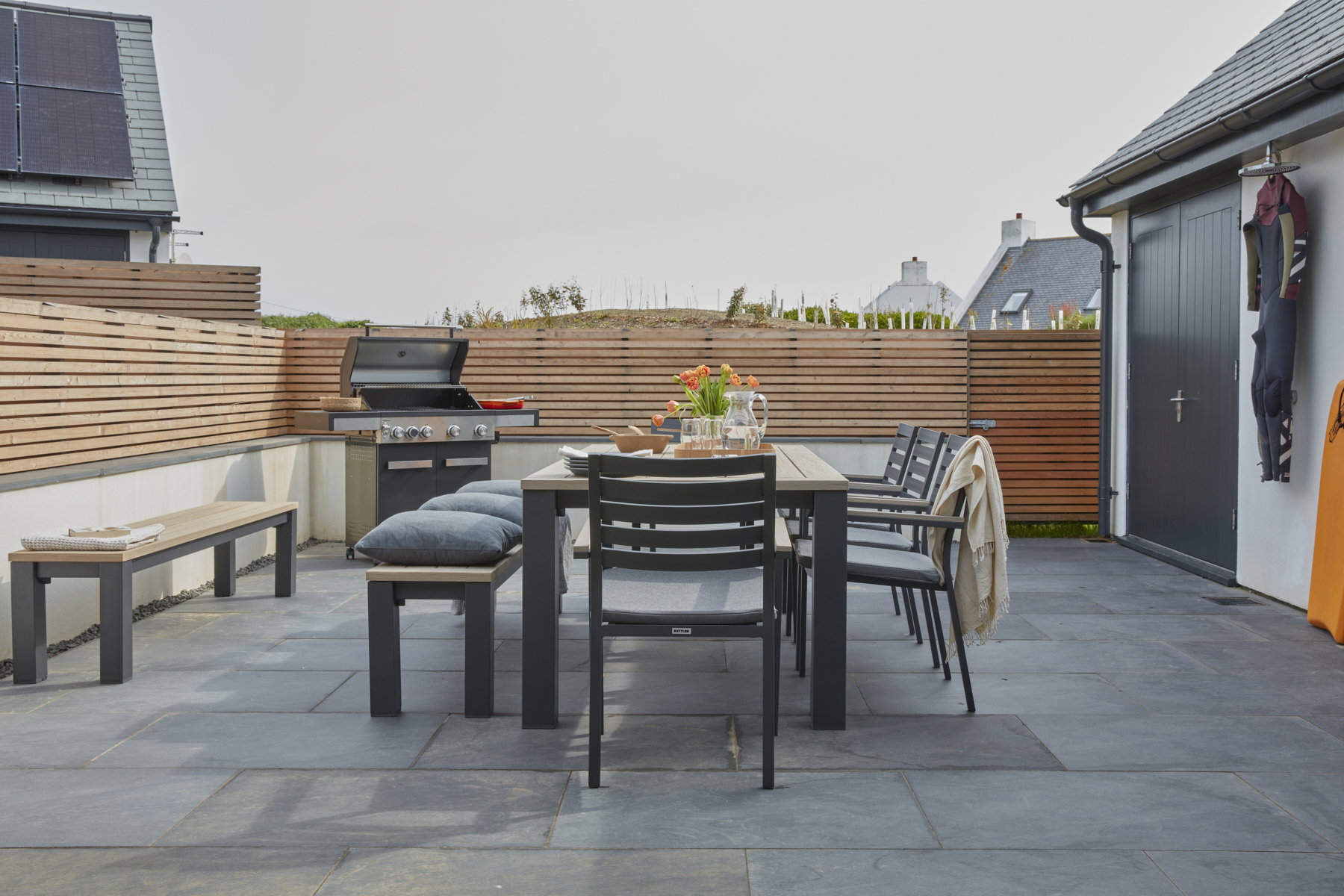 Outside, there is an alternative dining area as well as a hot shower to wash off after a surf, with side access to the utility room.