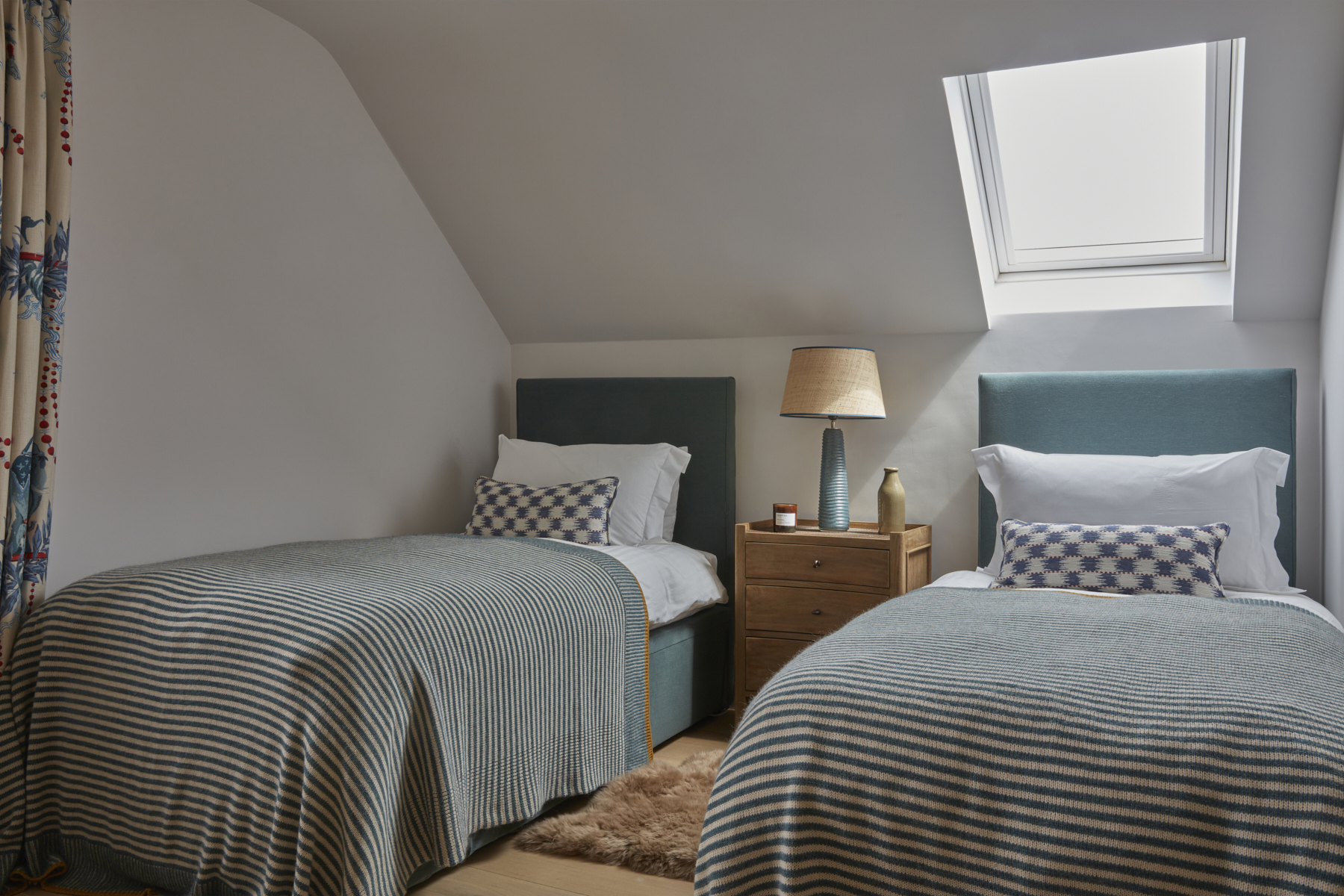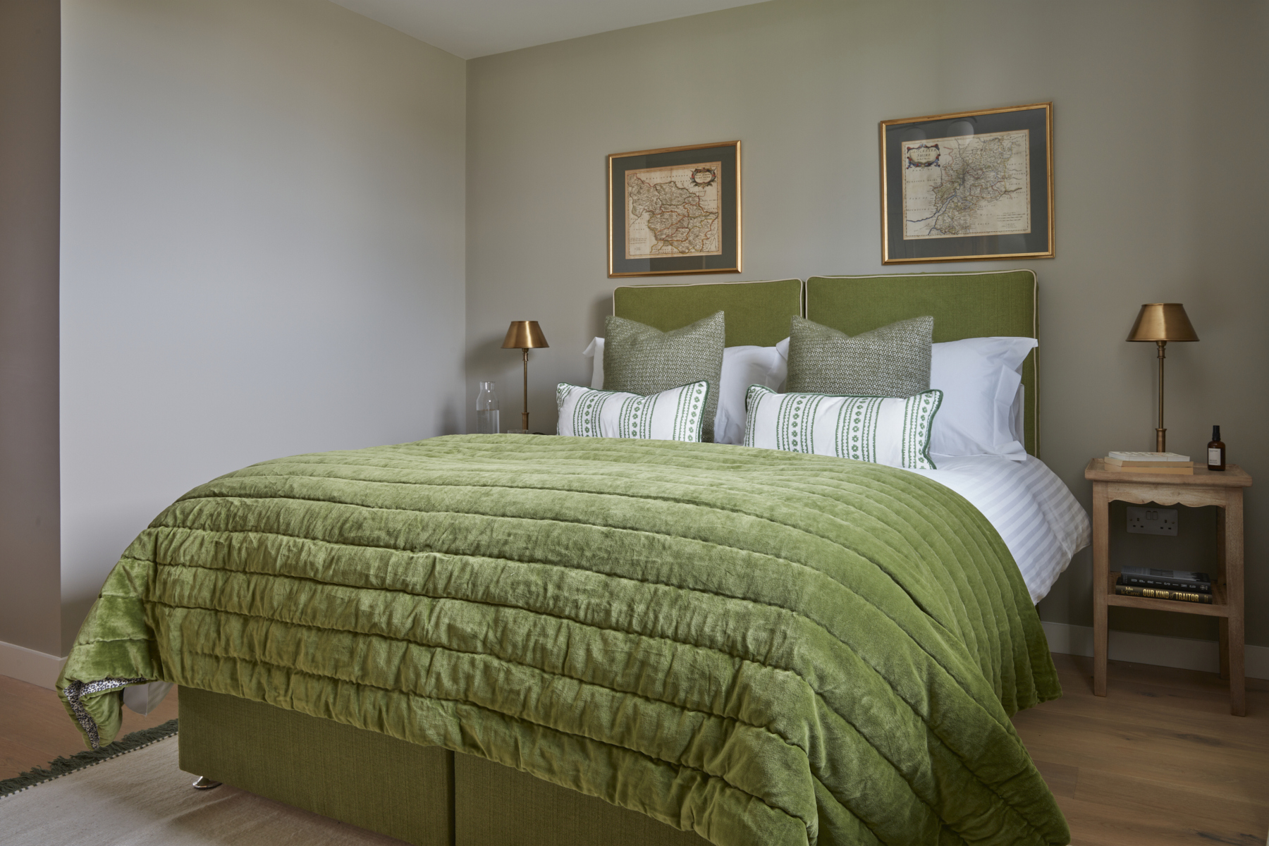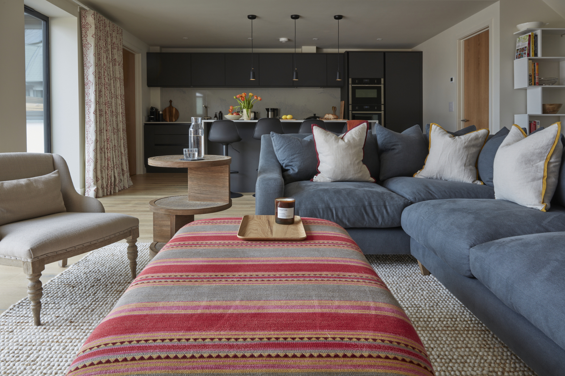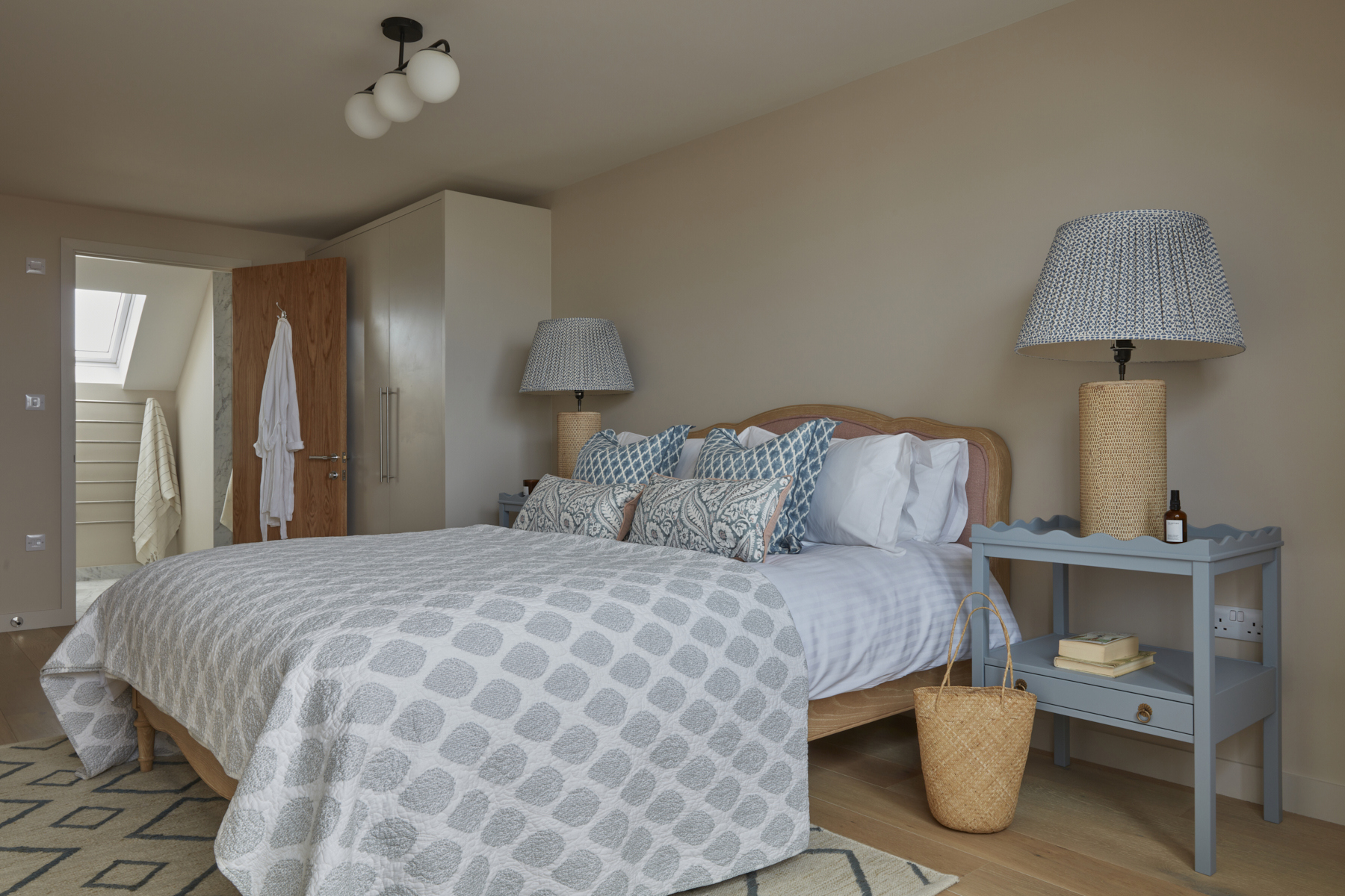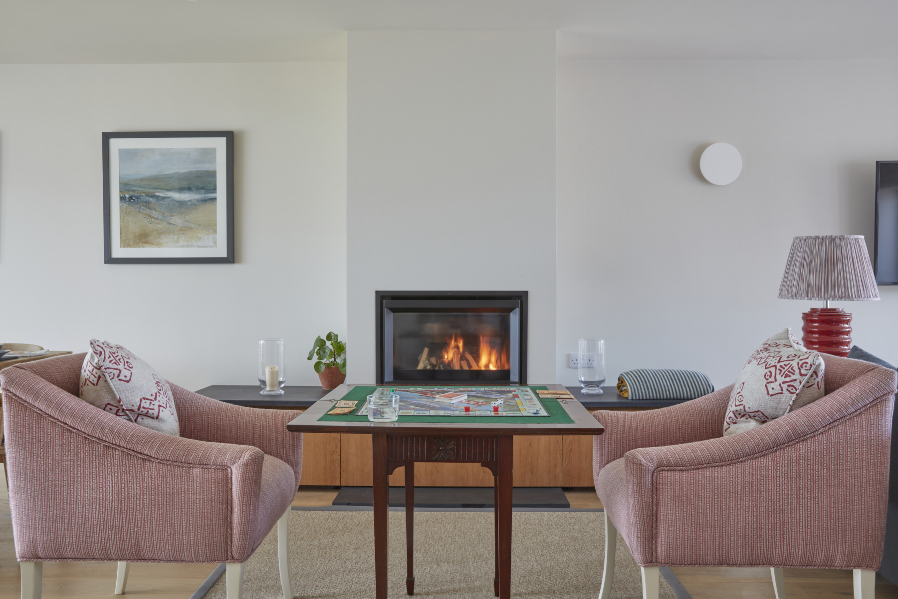 Aaru has a lovely neutral palette of sage, dusty pinks and warm whites which are offset with a striking graphite kitchen and island, fully equipped with top of the range appliances. Filled with natural light from the large glass doors at either side of the room, the living area has a log fire and two comfy sitting areas which is the perfect space to relax and unwind in after a day spent exploring.