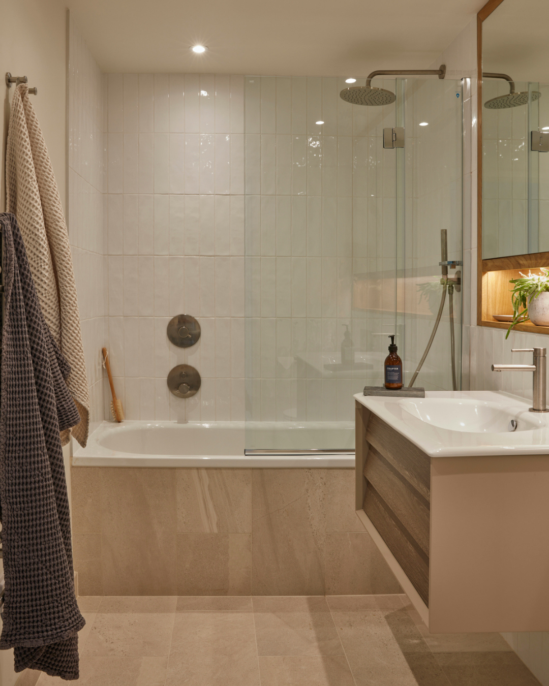 Family Bathroom: Bath with shower over, heated towel rail, basin, w.c.