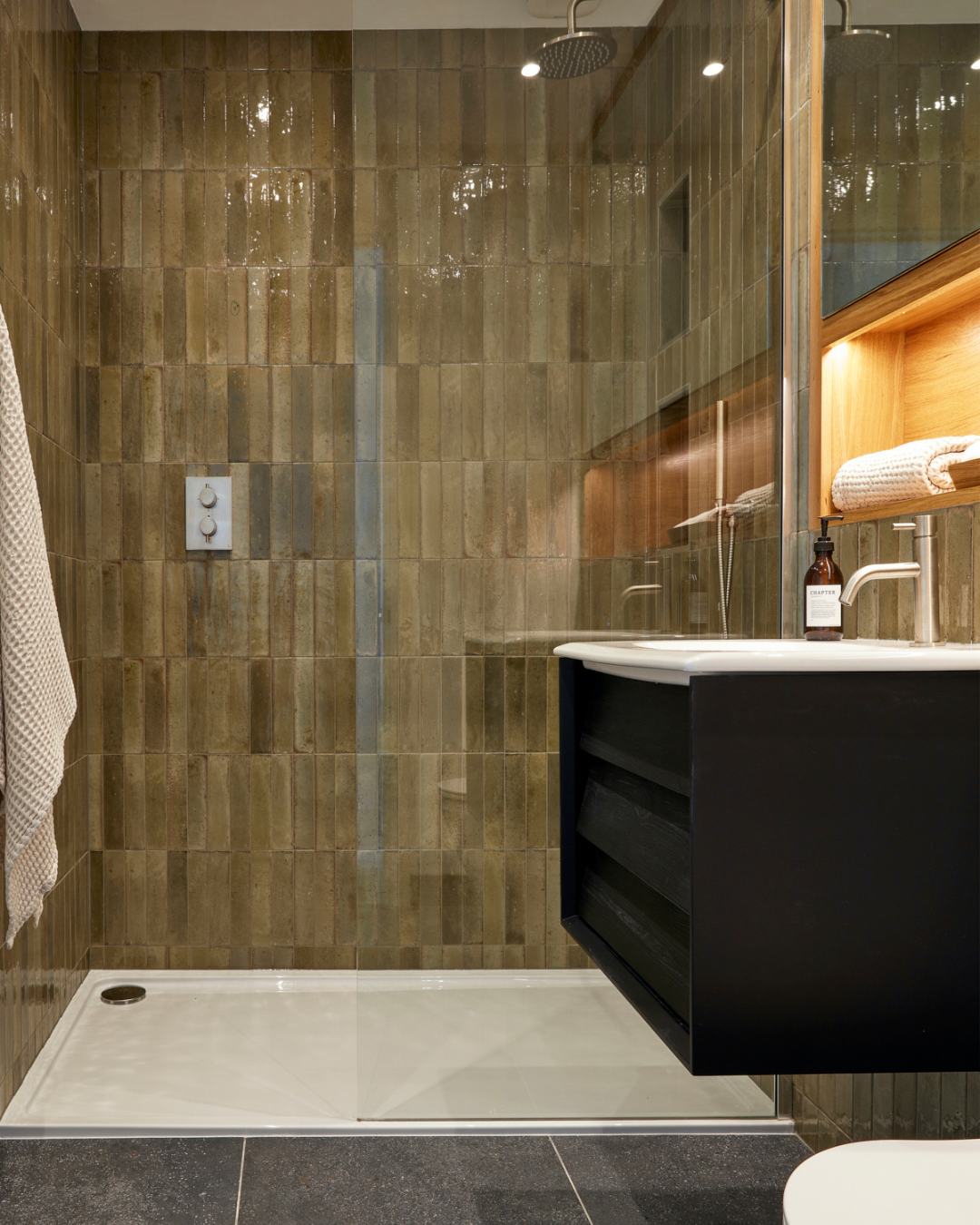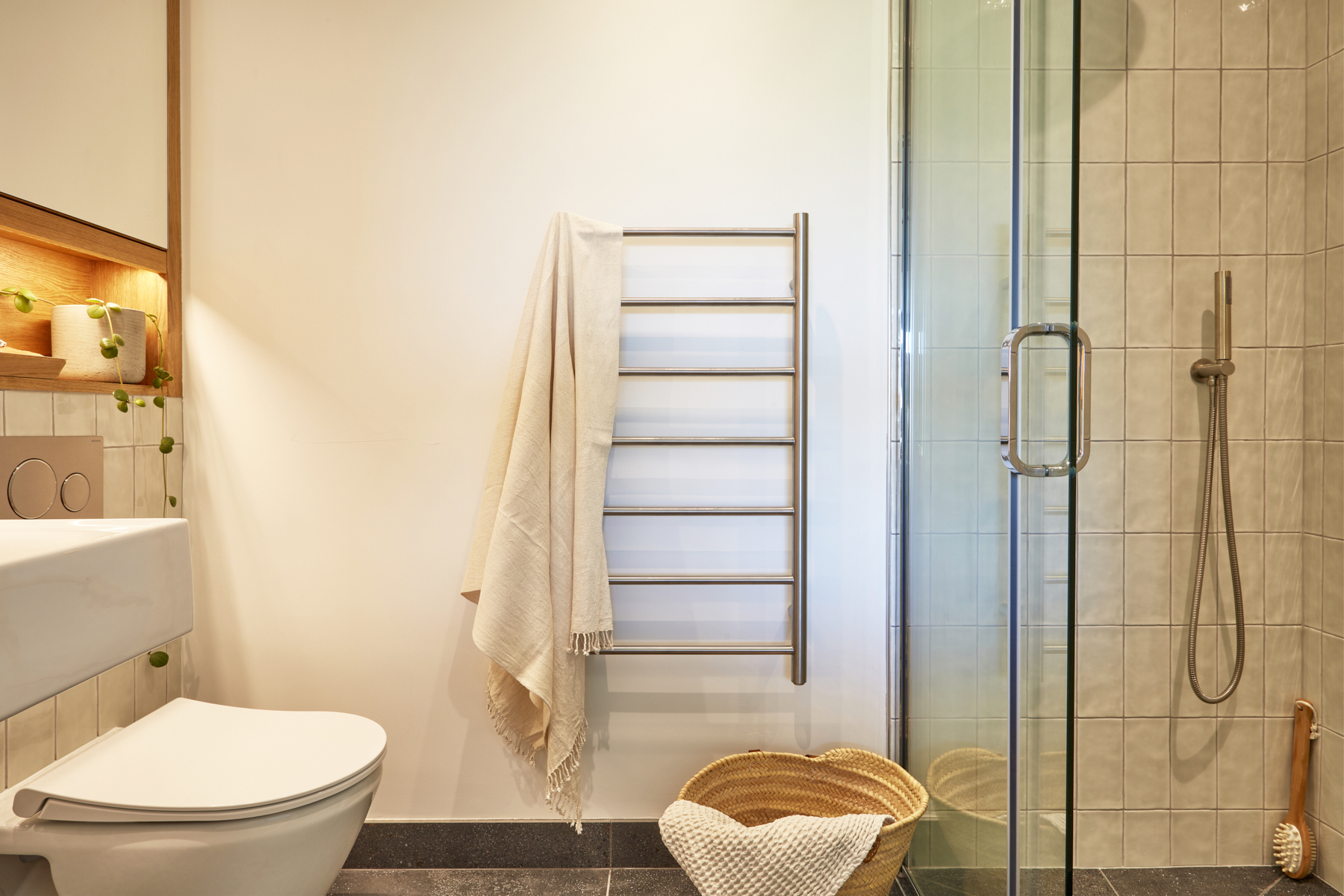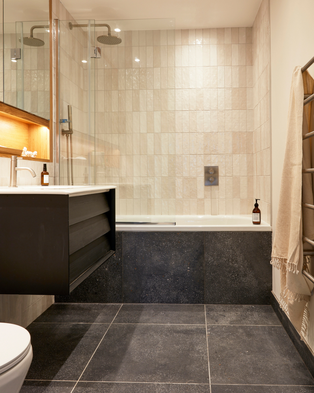 Family bathroom: Bath with shower over, heated towel rail, basin, w.c.