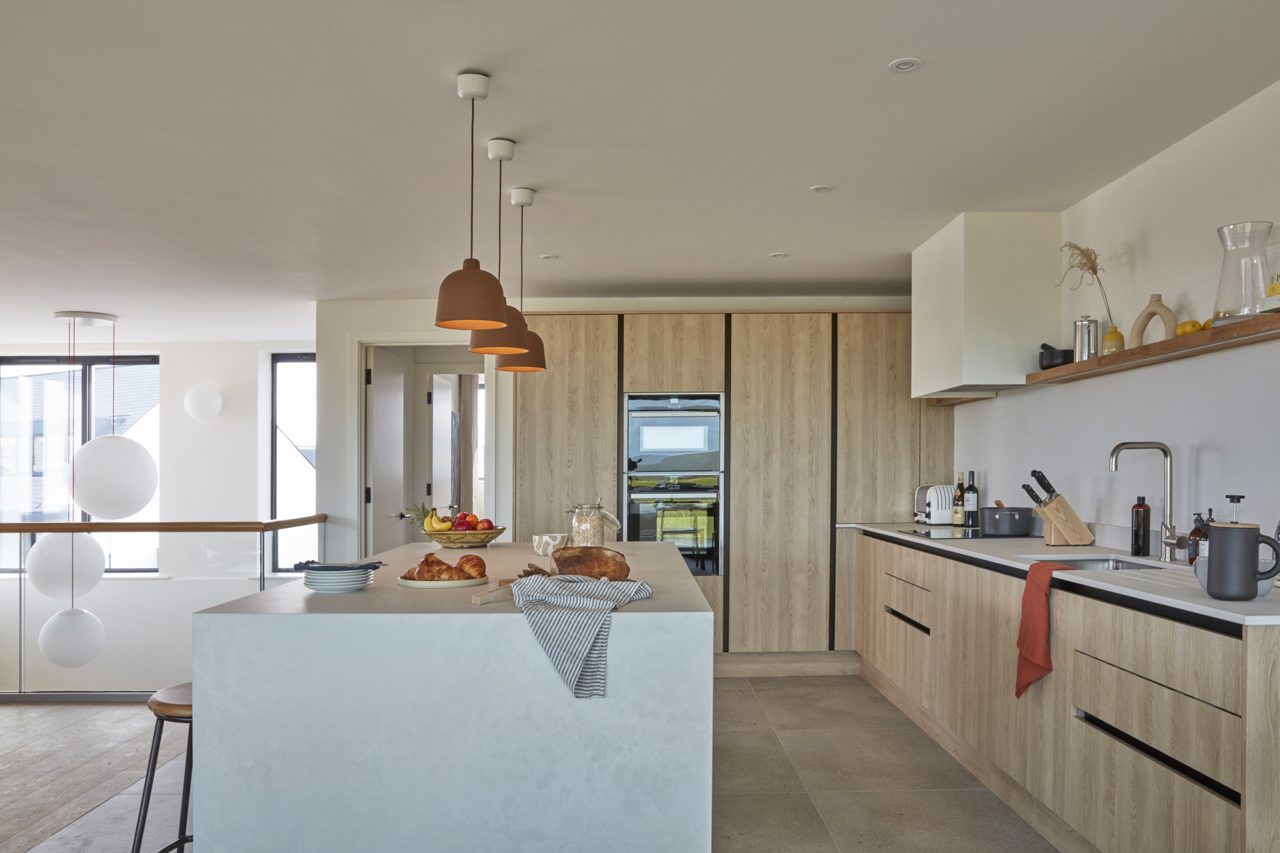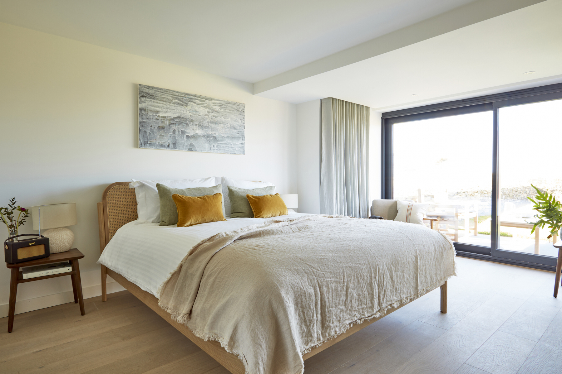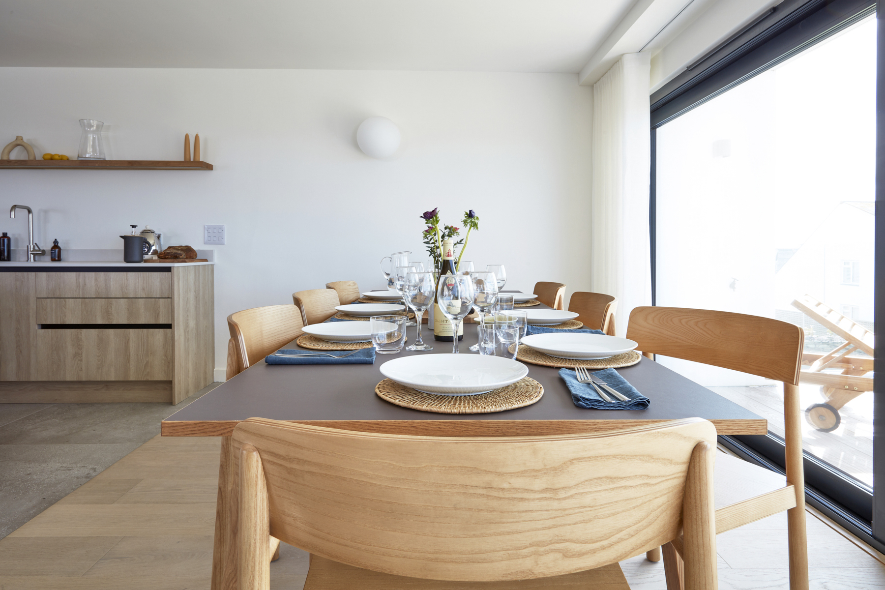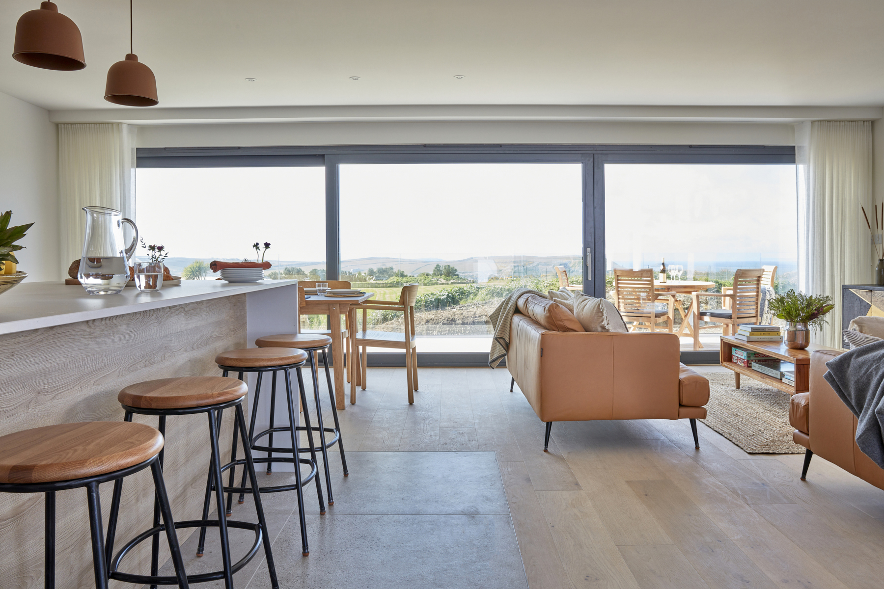 Soft tones and plush leather sofas provide a comfy space for you to relax and unwind, and a large dining table sits next to the kitchen area, perfect for friends and family gatherings. The kitchen features a large sociable island with concrete worktops, and has everything you will need to cook and entertain whilst on holiday. The main event here, are the large sliding doors which open out onto a spacious first floor balcony, bringing the outside in.
