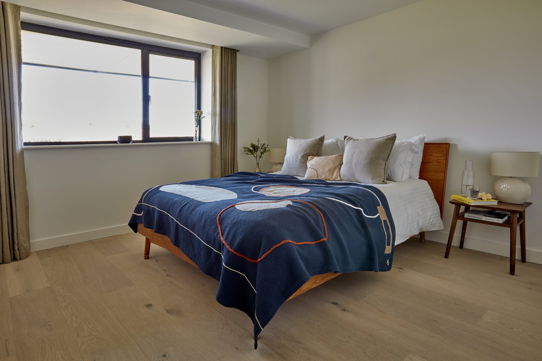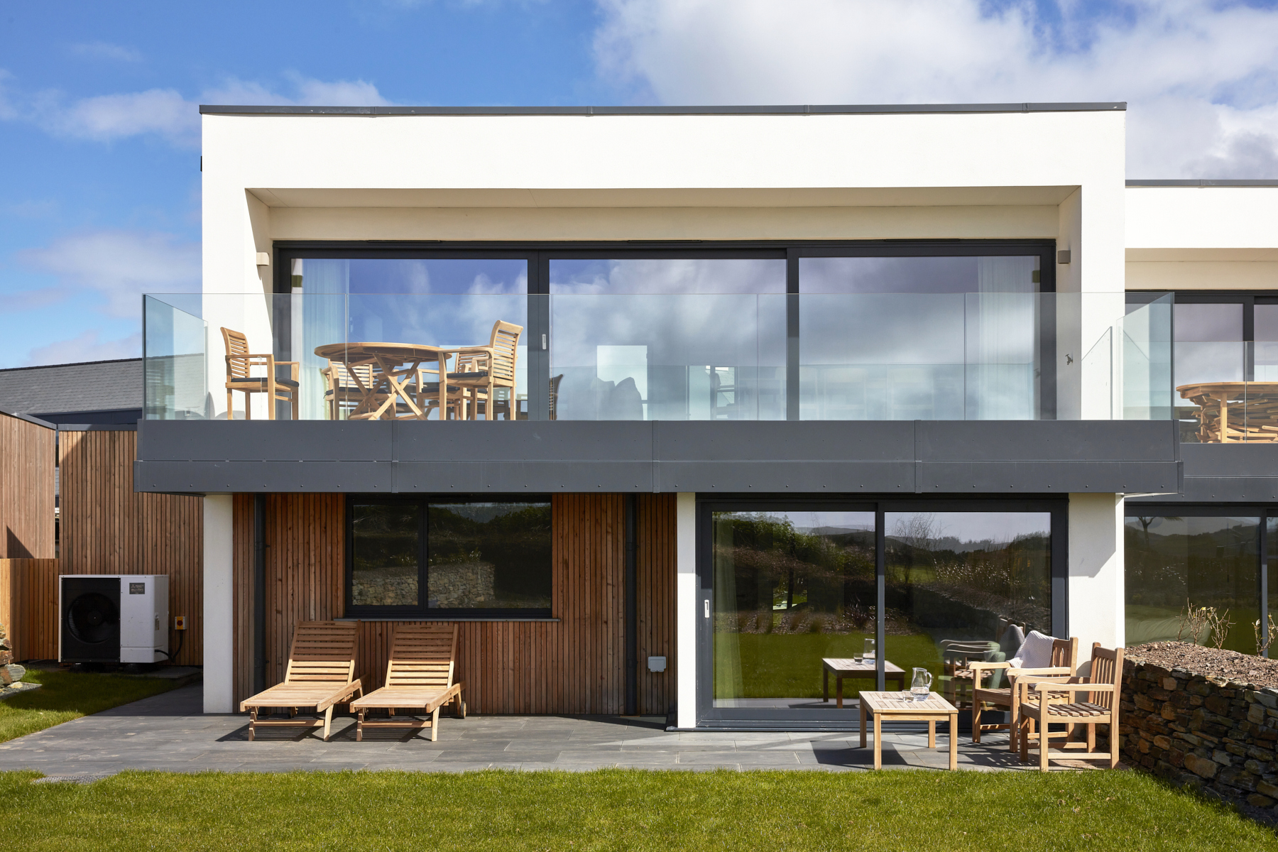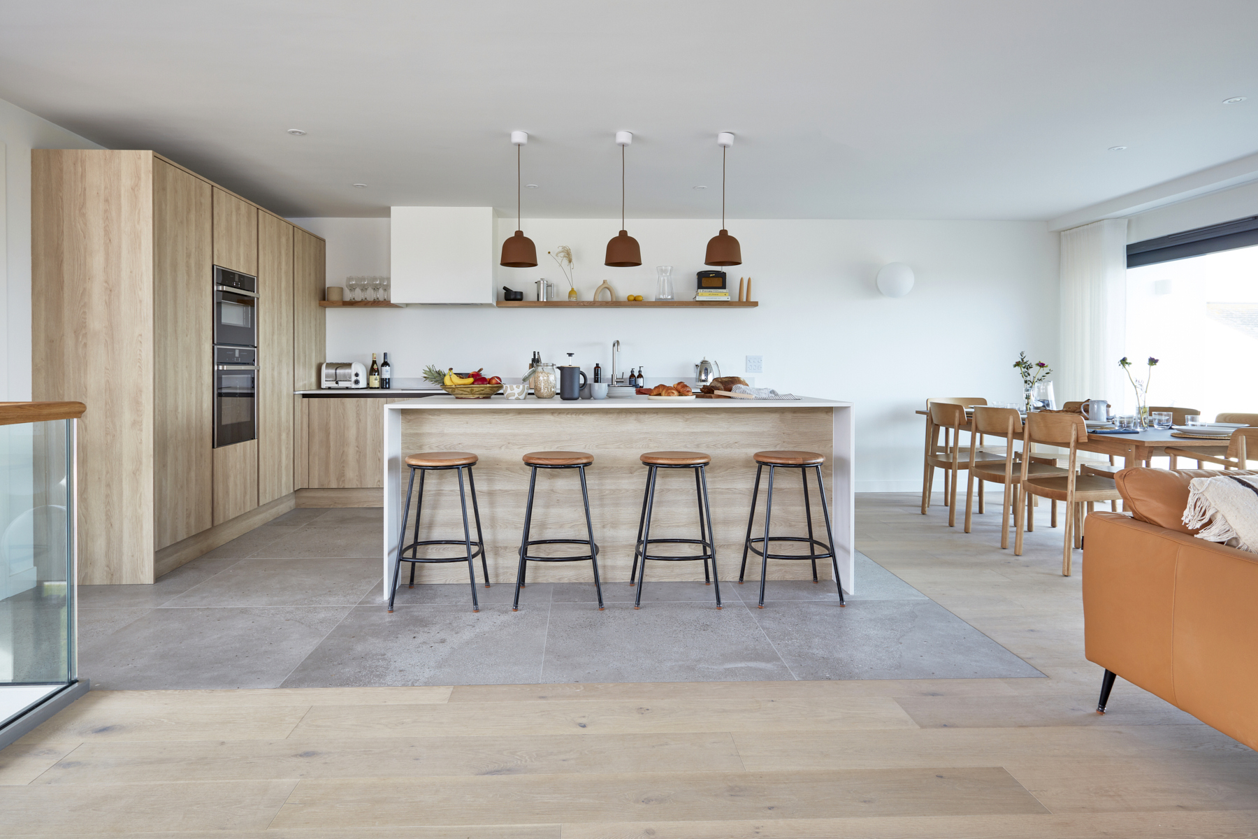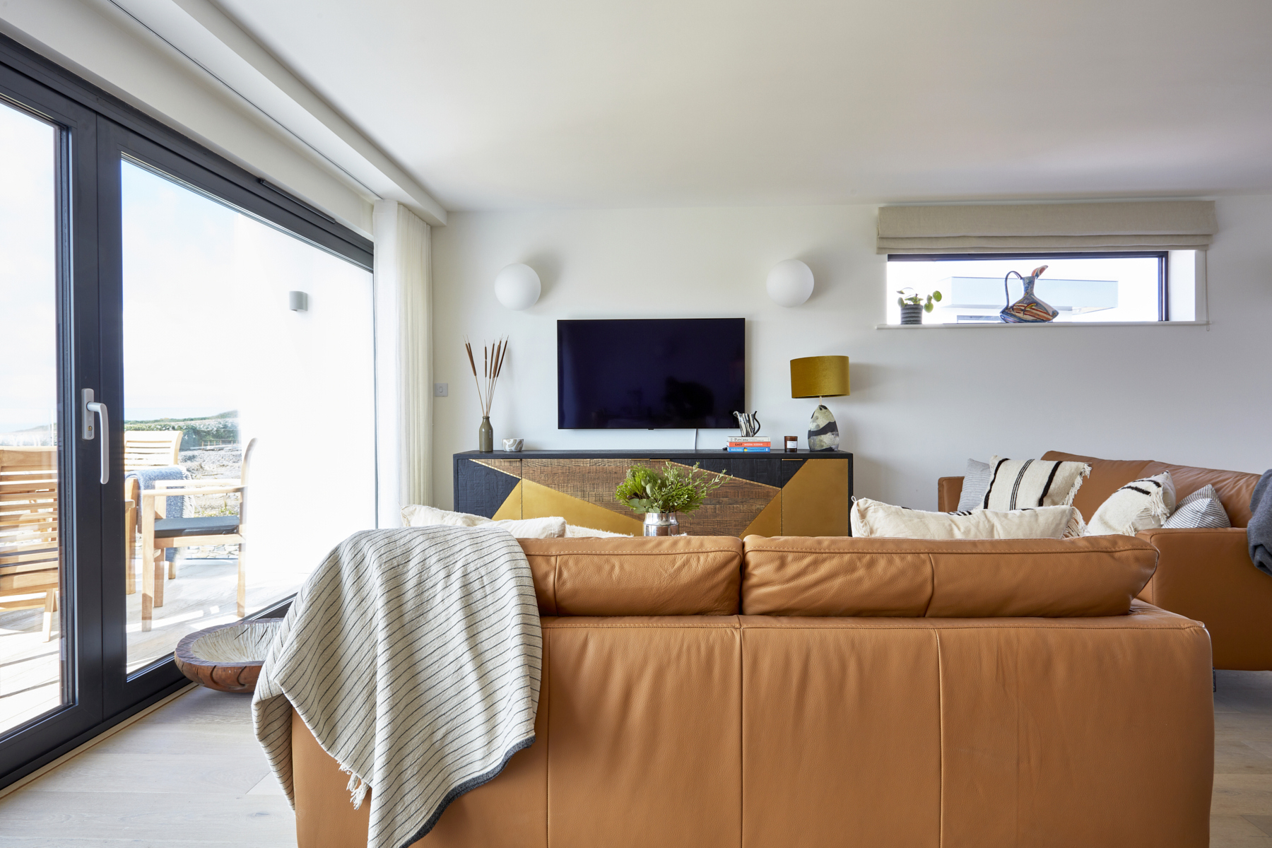Soft tones and plush leather sofas provide a comfy space for you to relax and unwind, and a large dining table sits next to the kitchen area, perfect for friends and family gatherings. The kitchen features a large sociable island with concrete worktops, and has everything you will need to cook and entertain whilst on holiday. The main event here, are the large sliding doors which open out onto a spacious first floor balcony, bringing the outside in.