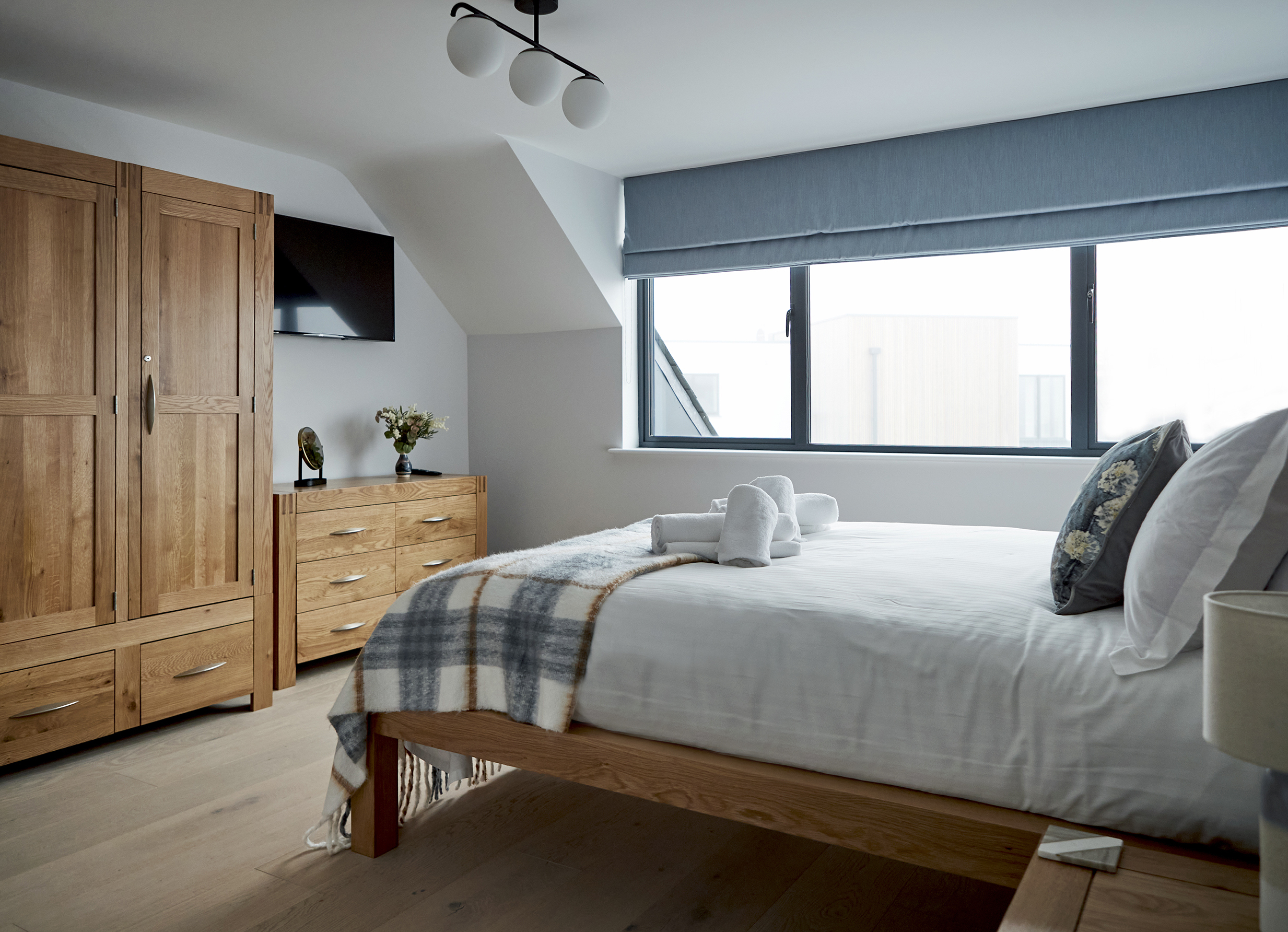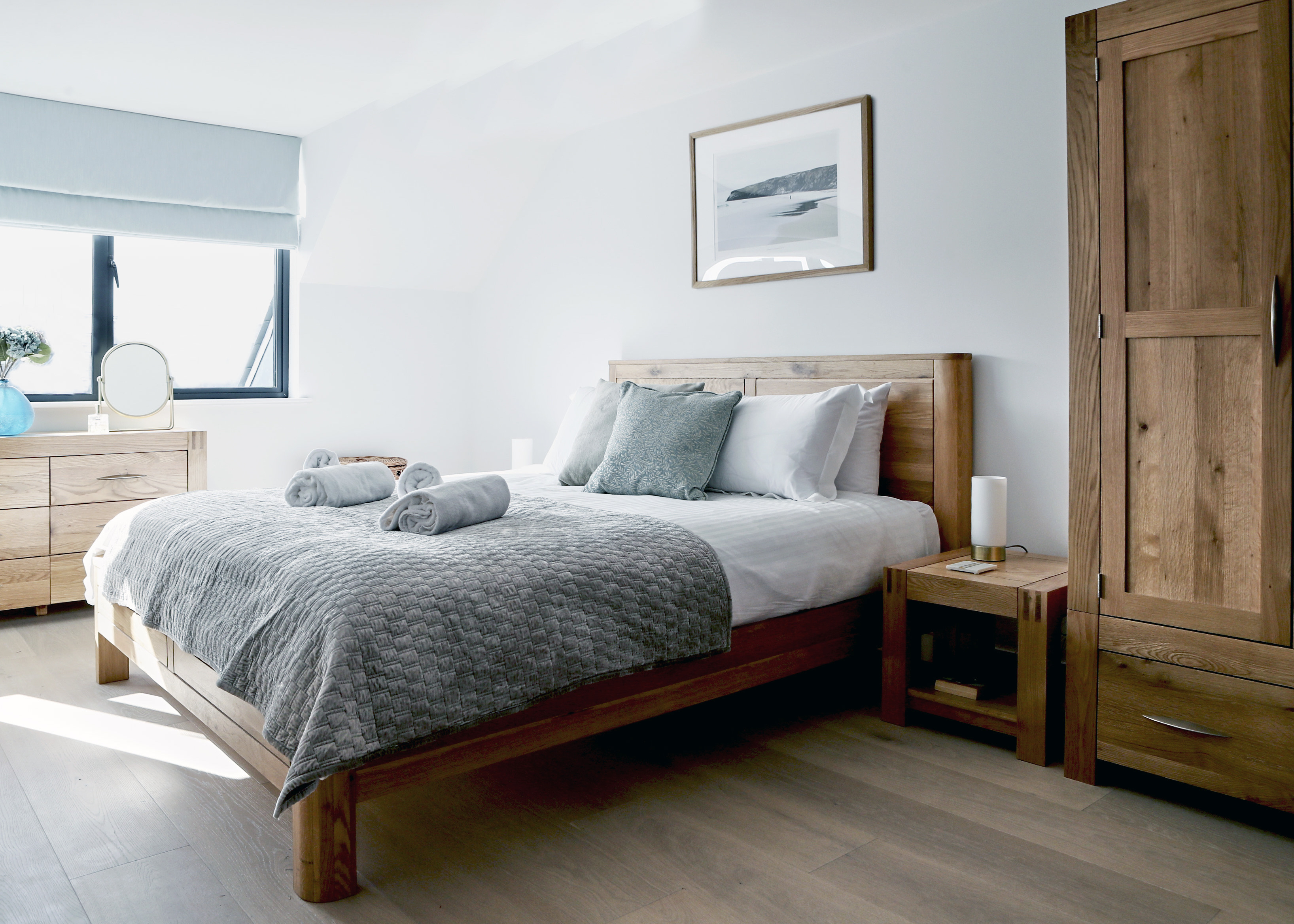 Eythin is decorated in natural muted tones that reflect the colours of this stunning coastal landscape and complimented by the display of local landscape photography. There is a wonderful view from the terrace across fields towards St Minver church and glimpses of the Estuary towards Rock from the upstairs bedrooms.
