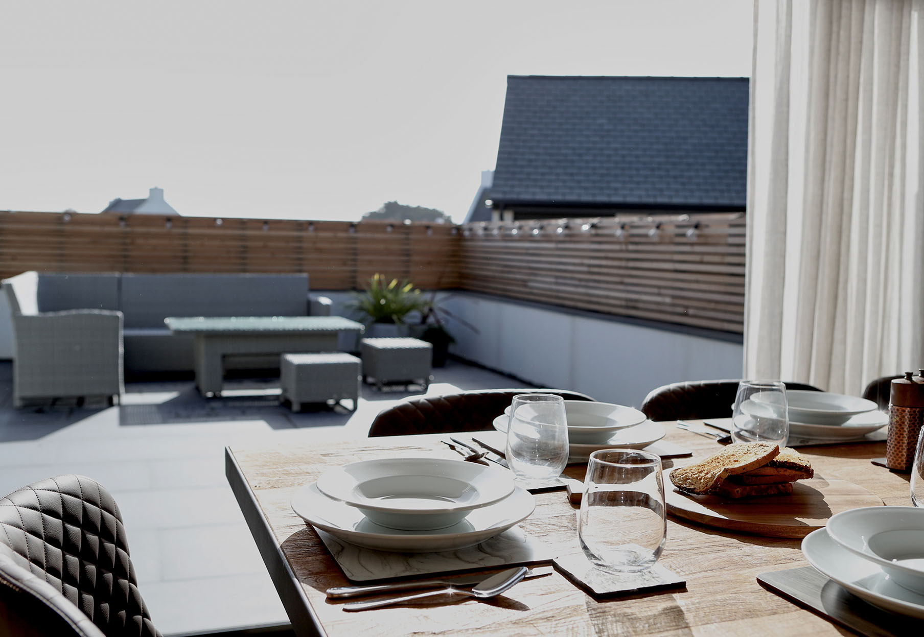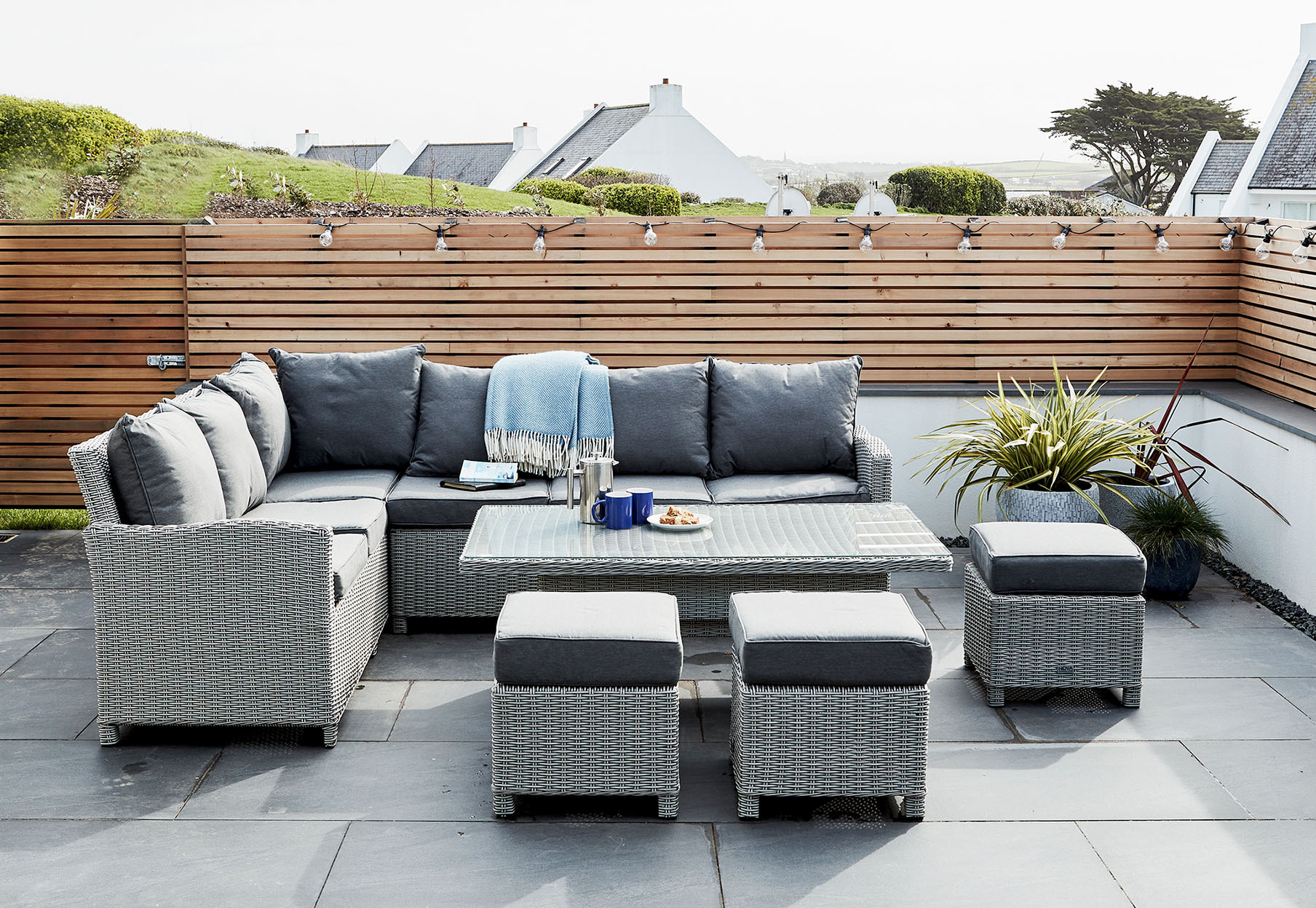 Outside there is a BBQ and a large corner sofa unit with individual stools and a raising table for lounging or dining al fresco. From the terrace there is access to the stylish wet room and utility.