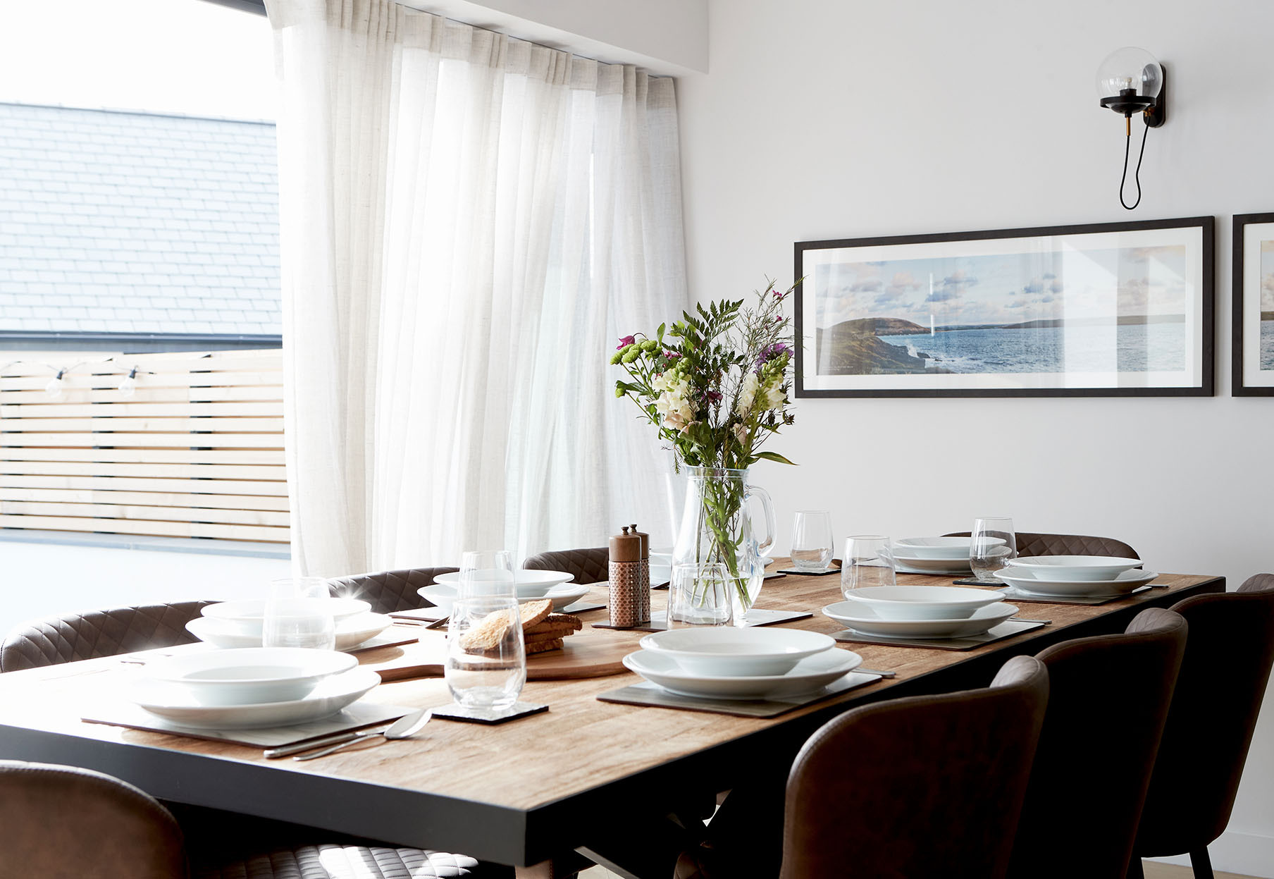 The large dining table has comfortable seating and sits alongside the bi fold doors to the enclosed south east facing private terrace.
