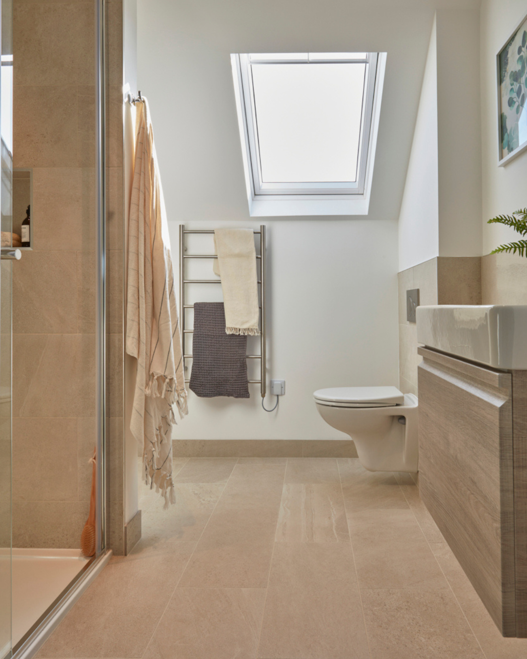Ensuite shower room: Thermostatic shower, heated towel rail, basin & w.c.