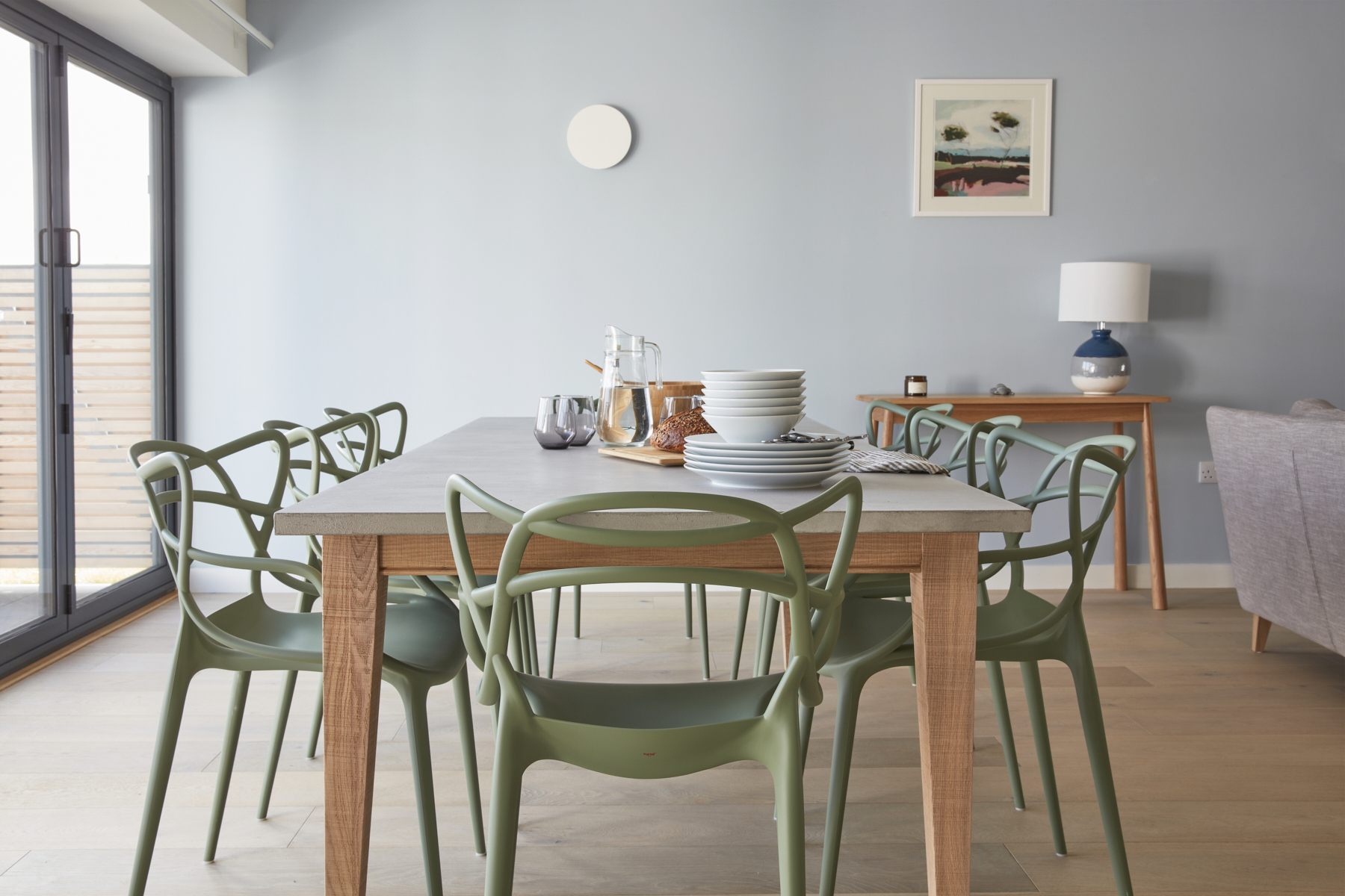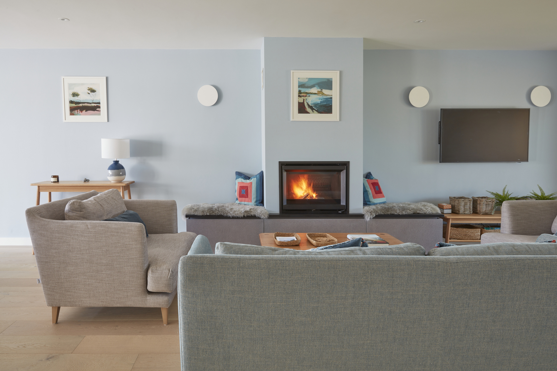 Sitting & Dining area: Wall-mounted Samsung Frame TV with Xbox live and Freeview, Sonos speaker, BT full fibre broadband, inset log burner, dining table & chairs, sofa & armchairs, bi-fold doors opening on to a spacious private terrace.