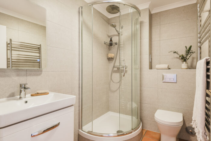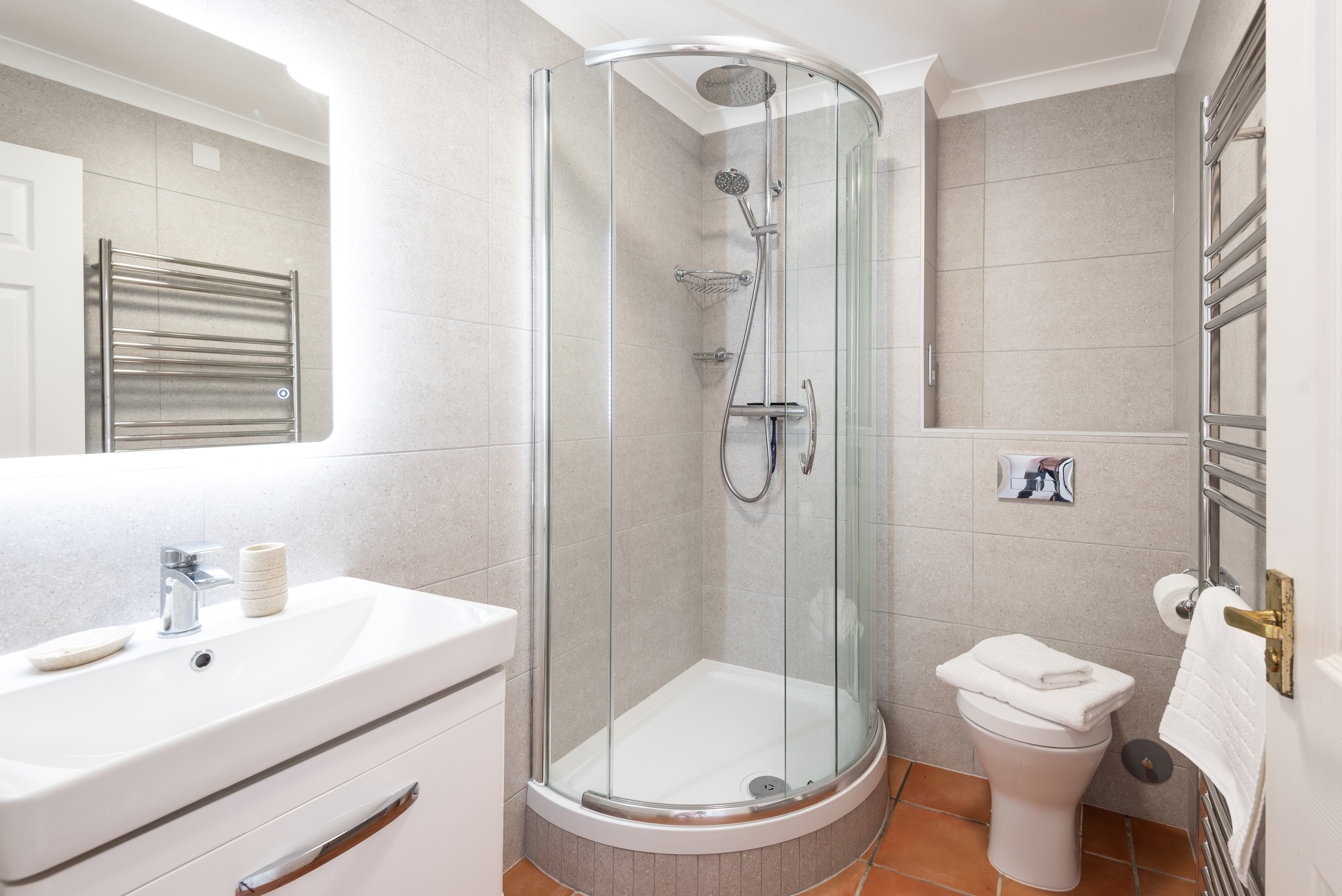 Shower Room: Thermostatic shower, heated towel rail, basin, w.c.