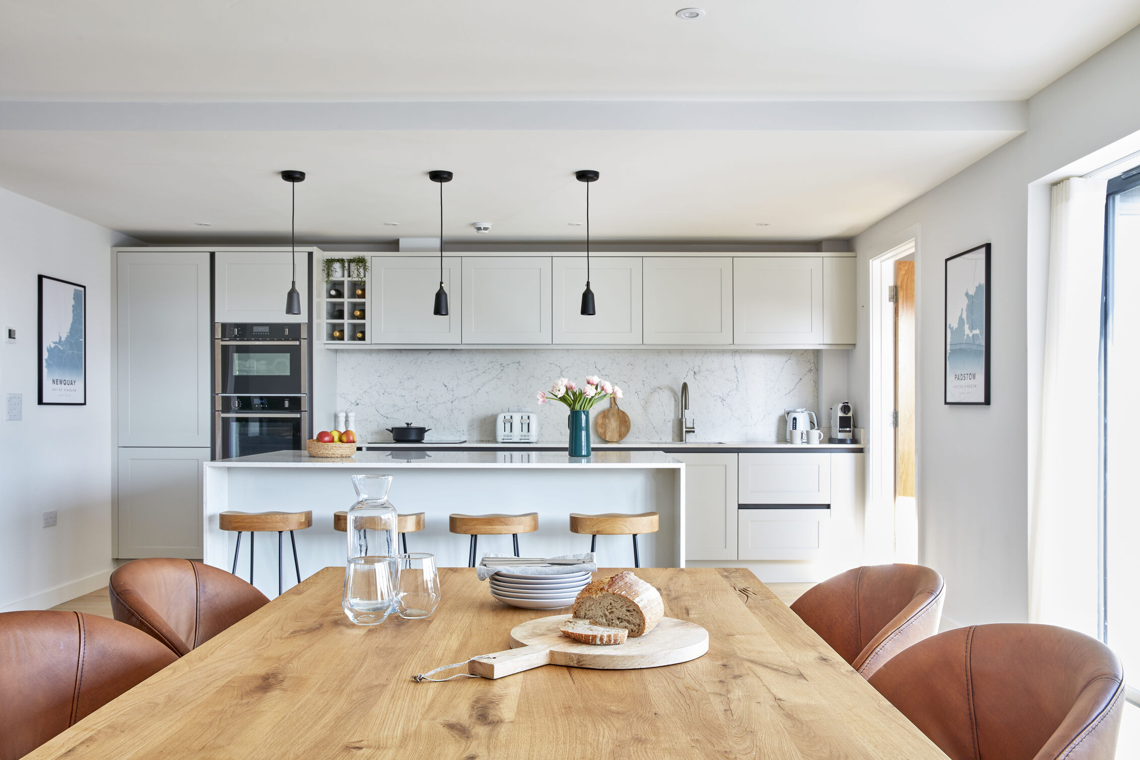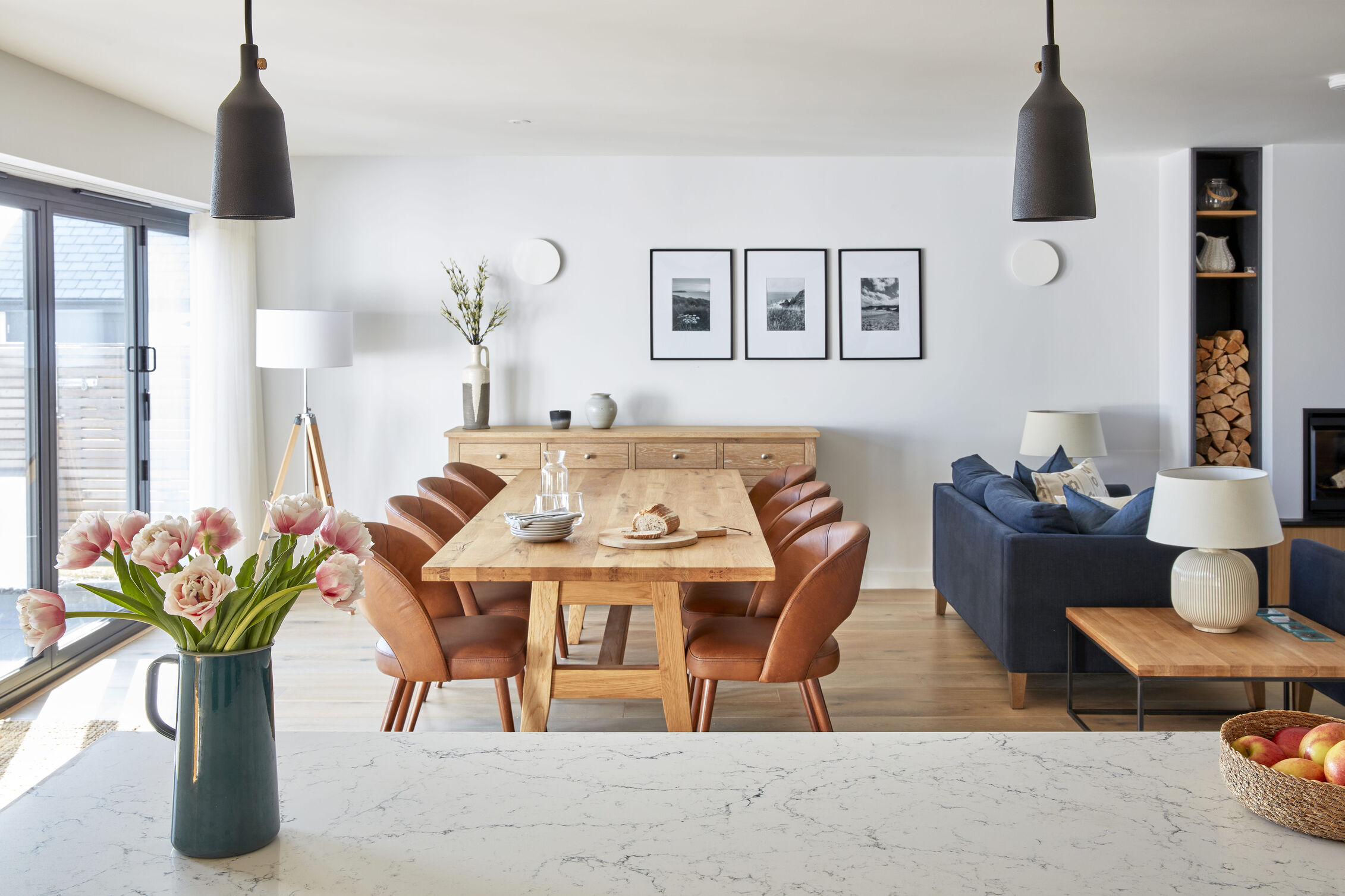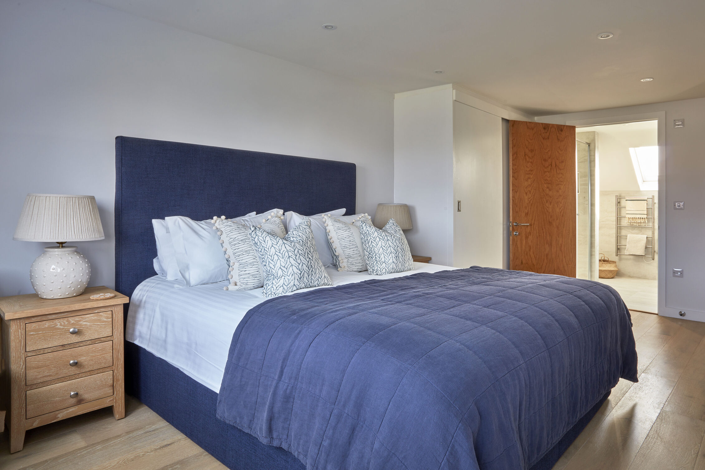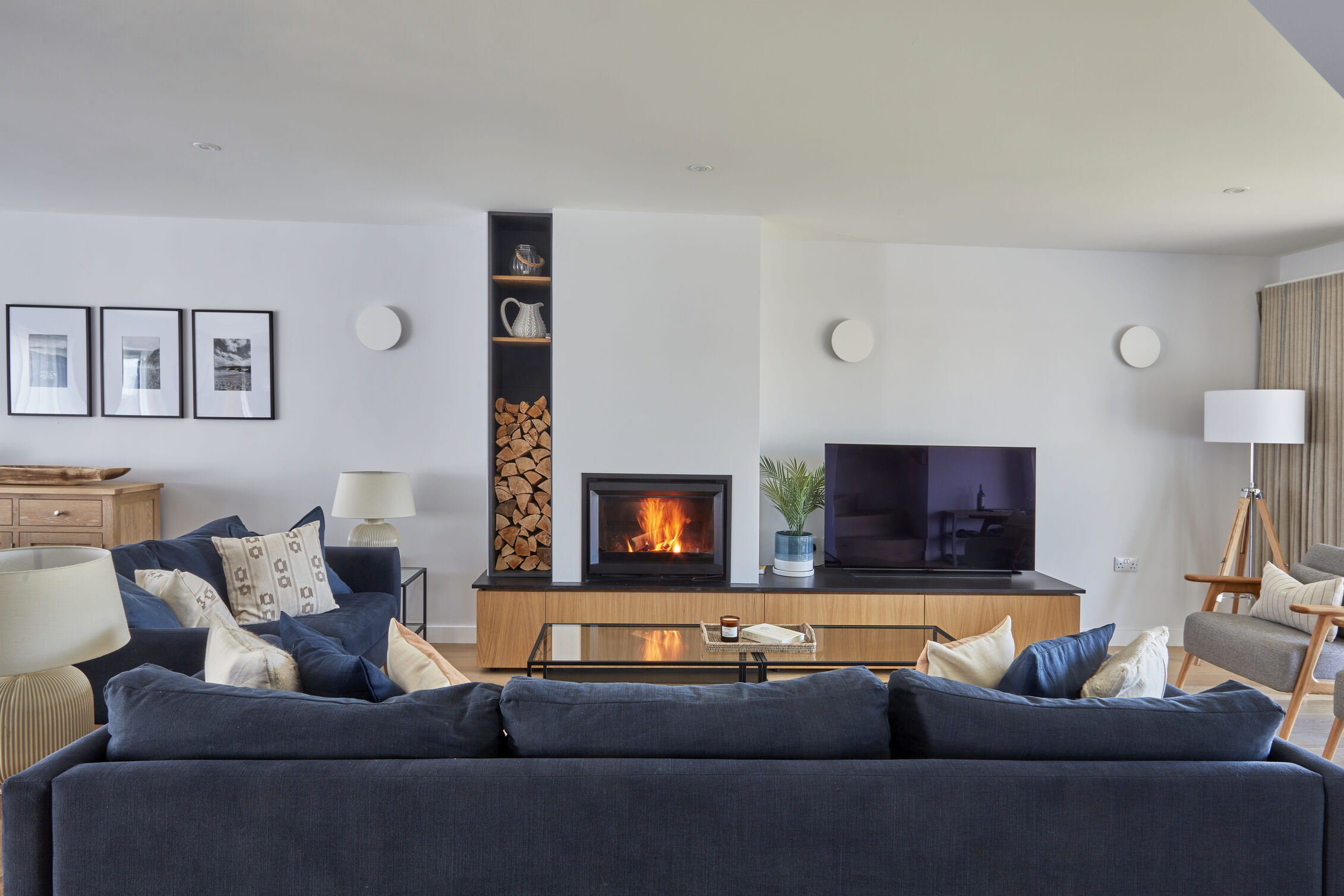 Upon entering, you'll find an airy open-plan living space that harmoniously blends the sitting room, kitchen and dining area, all adorned in soothing navy and slate hues that echo the Cornish coast. Gather around the bespoke oak dining table with plush leather chairs to enjoy meals with family and friends or cosy up on the soft sofas in the sitting area to enjoy your favourite shows beside the inviting inset log burner perfect for those cooler months.