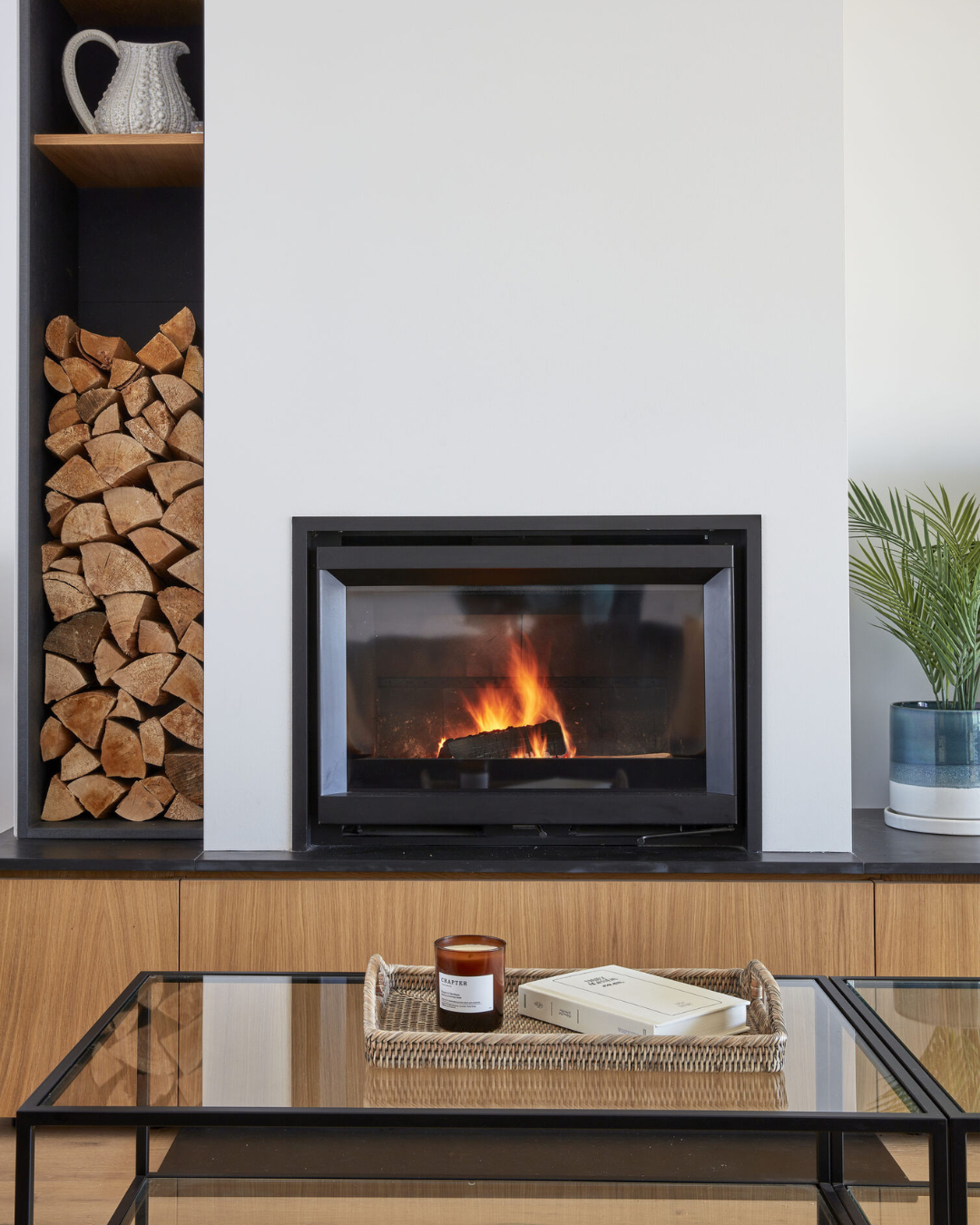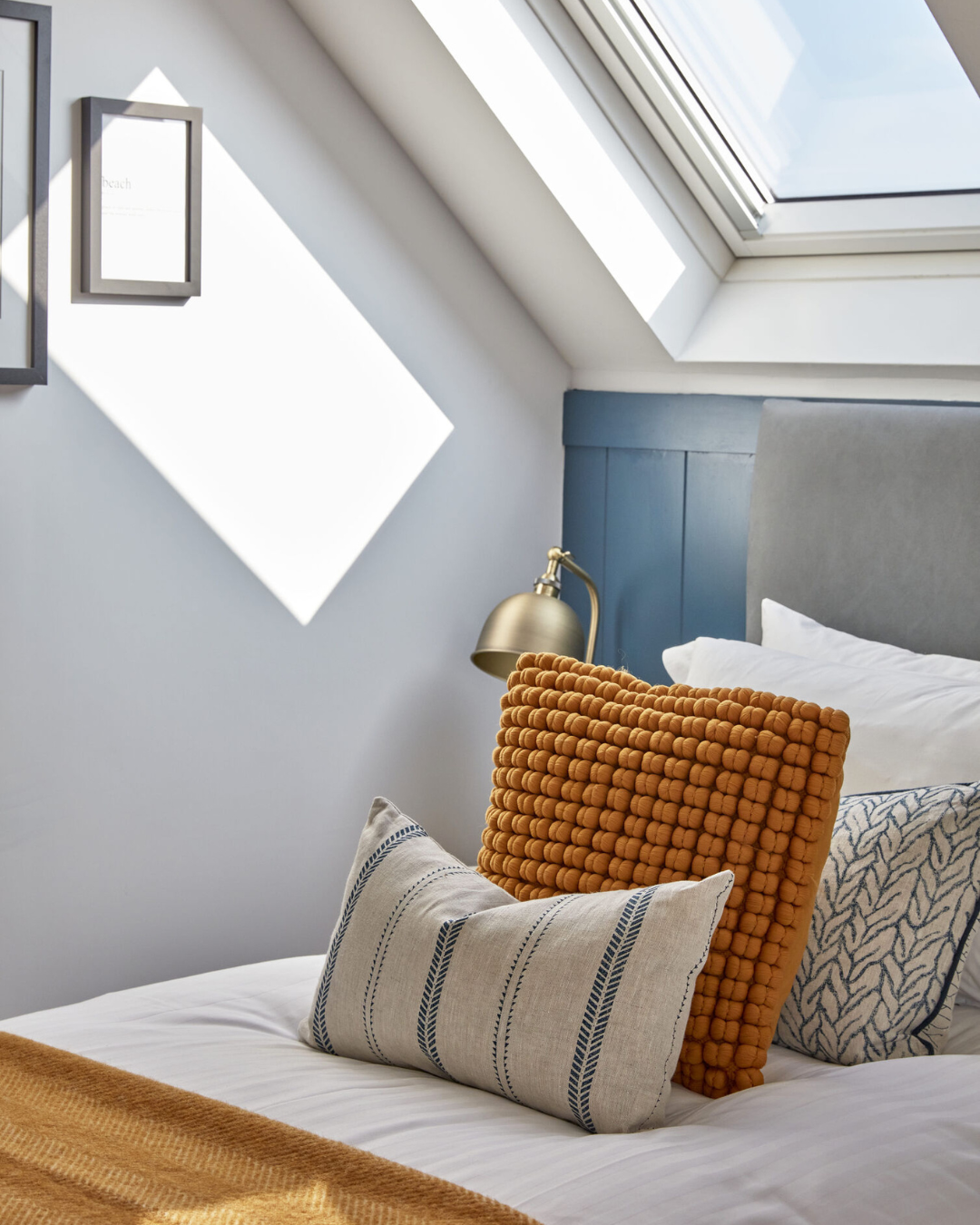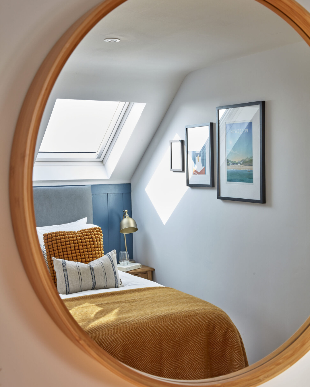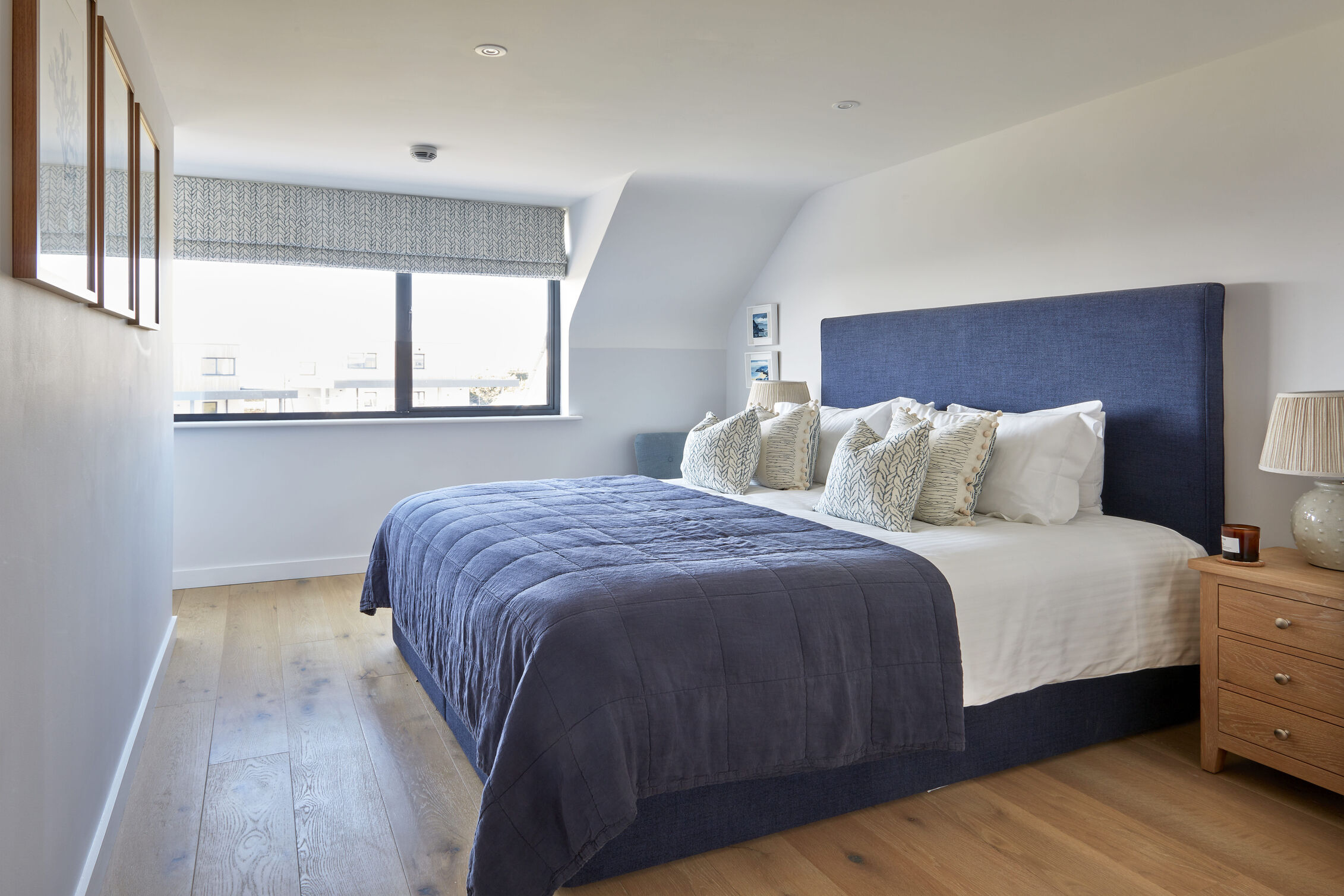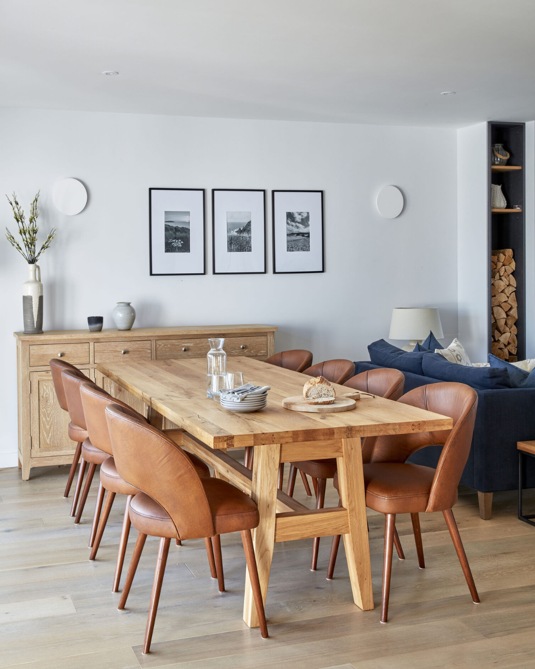 Upon entering, you'll find an airy open-plan living space that harmoniously blends the sitting room, kitchen and dining area, all adorned in soothing navy and slate hues that echo the Cornish coast. Gather around the bespoke oak dining table with plush leather chairs to enjoy meals with family and friends or cosy up on the soft sofas in the sitting area to enjoy your favourite shows beside the inviting inset log burner perfect for those cooler months.