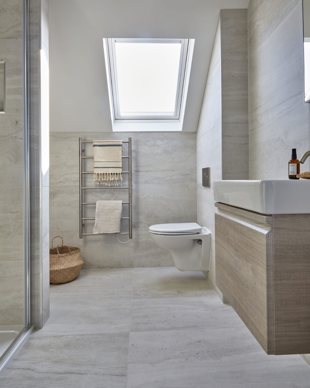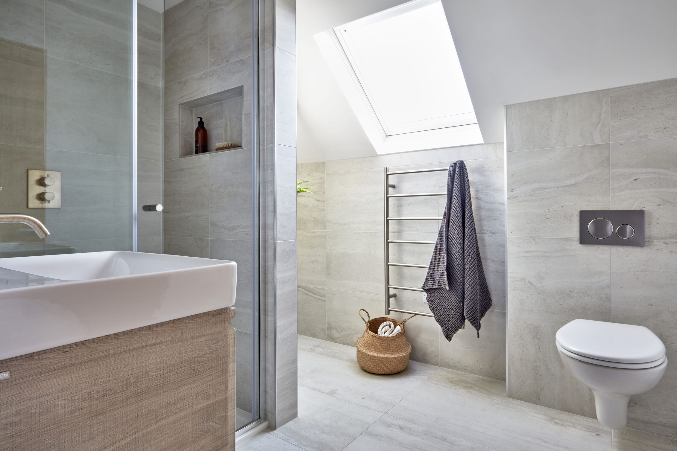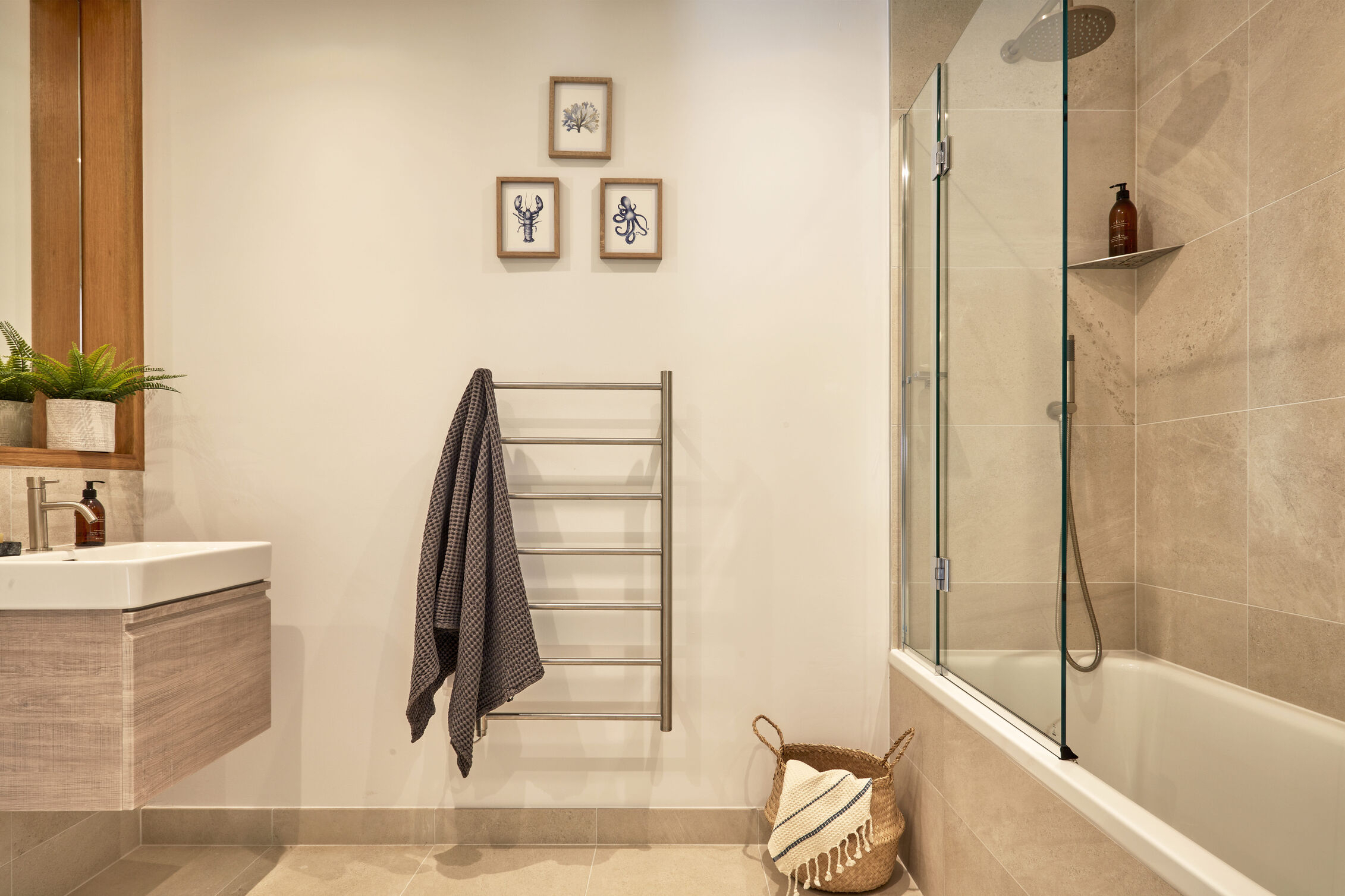 Family Bathroom: Shower, heated towel rail, basin & w.c.