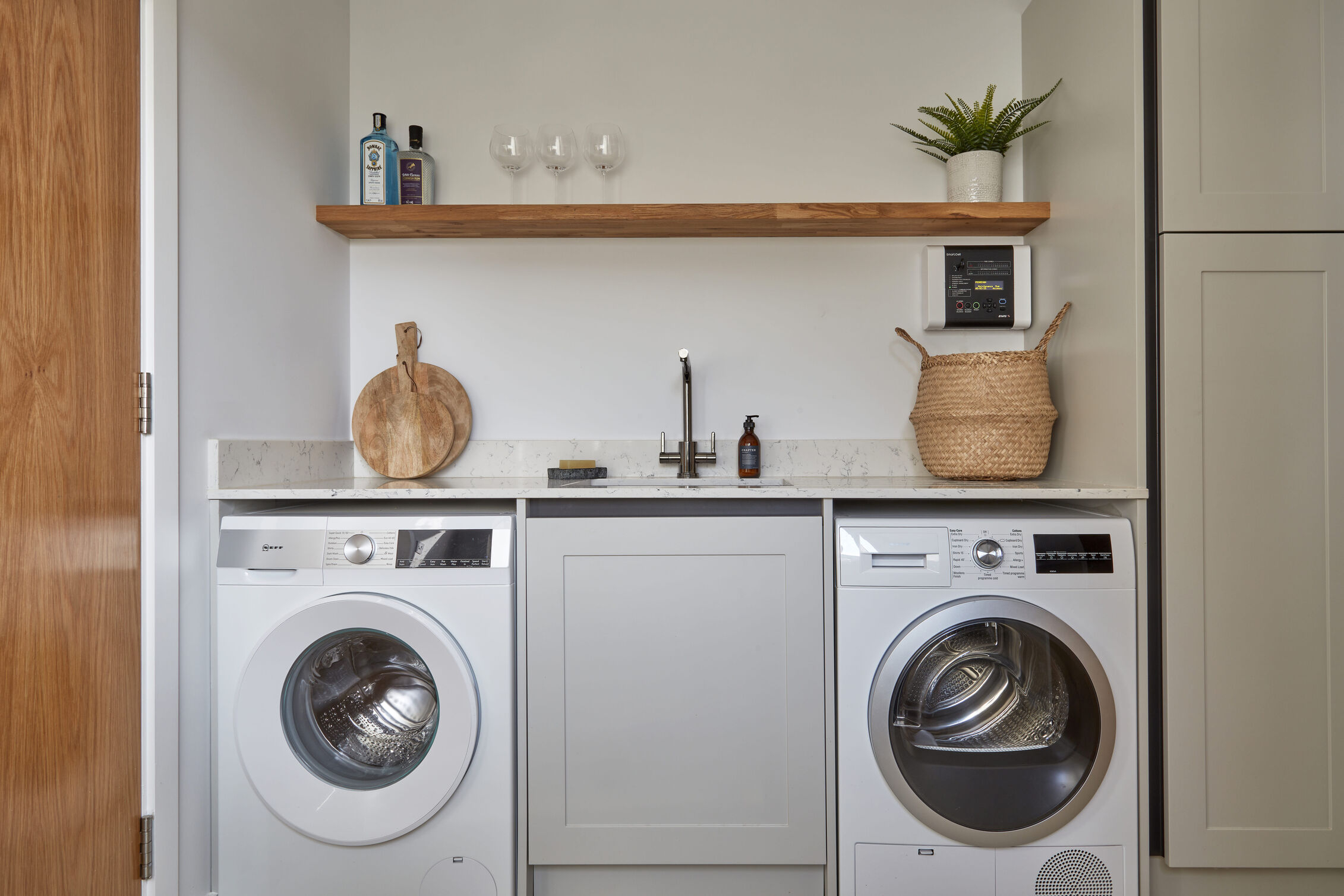 Utility Room: Washing machine, drier, ironing facilities, basin.