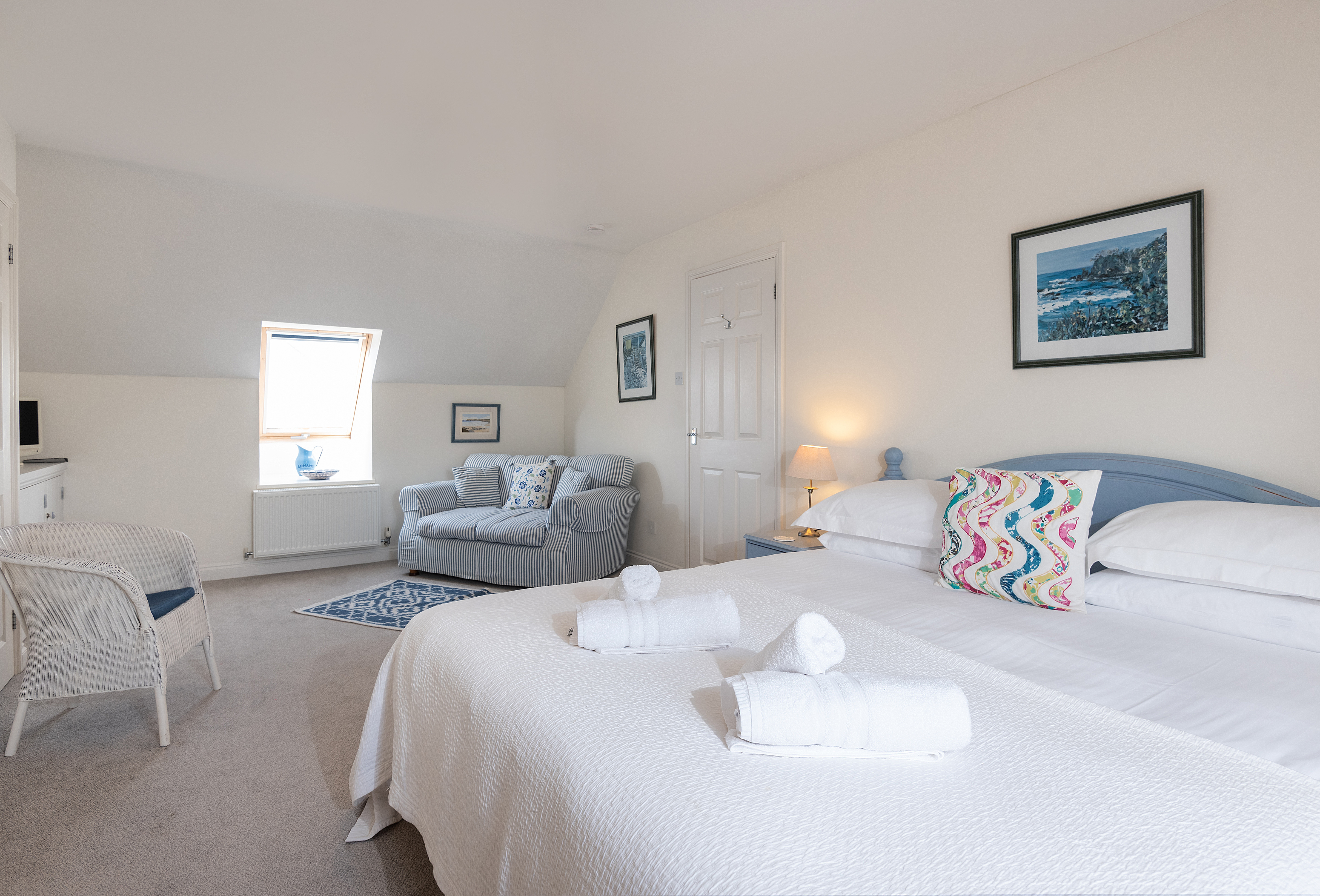 Bedroom 3: Master bedroom with super king bed (6’), TV, 2-seater sofa, wardrobe & chest drawers.