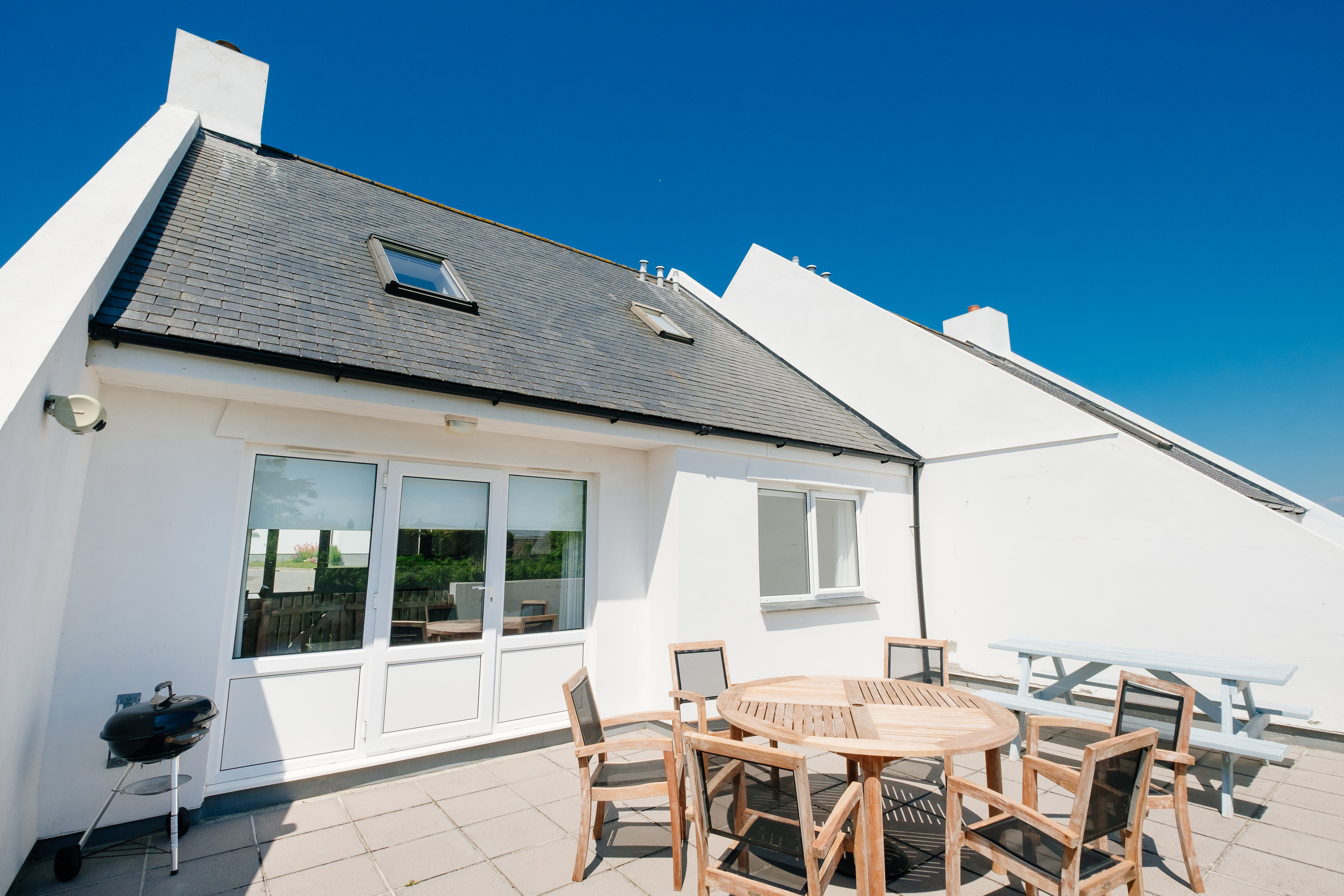 Downstairs, the spacious open-plan kitchen and living area has a light and airy feel, with glass doors which open out onto a secluded south-facing private patio with barbecue. The log fire is perfect for cosying up when it’s cold too.