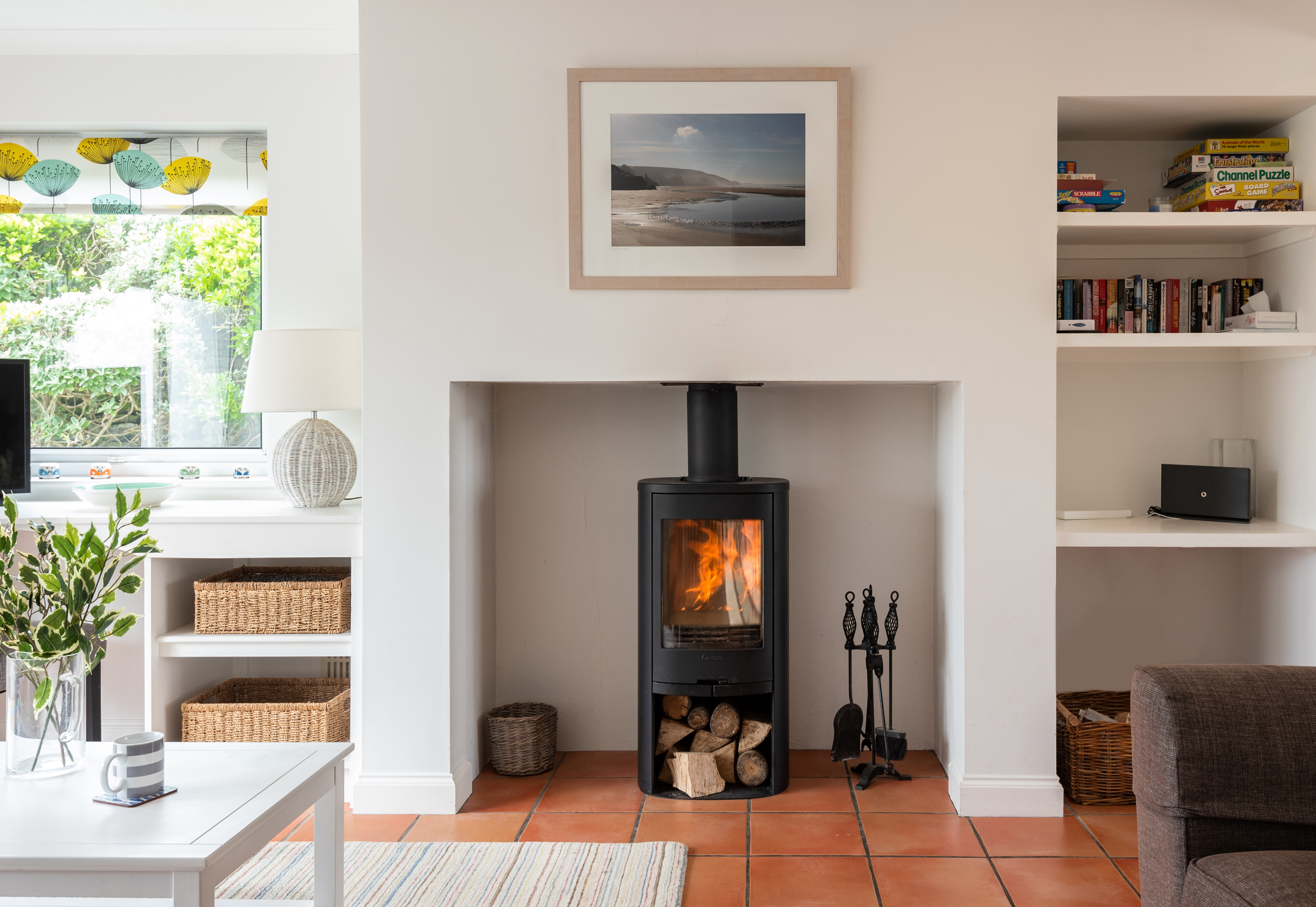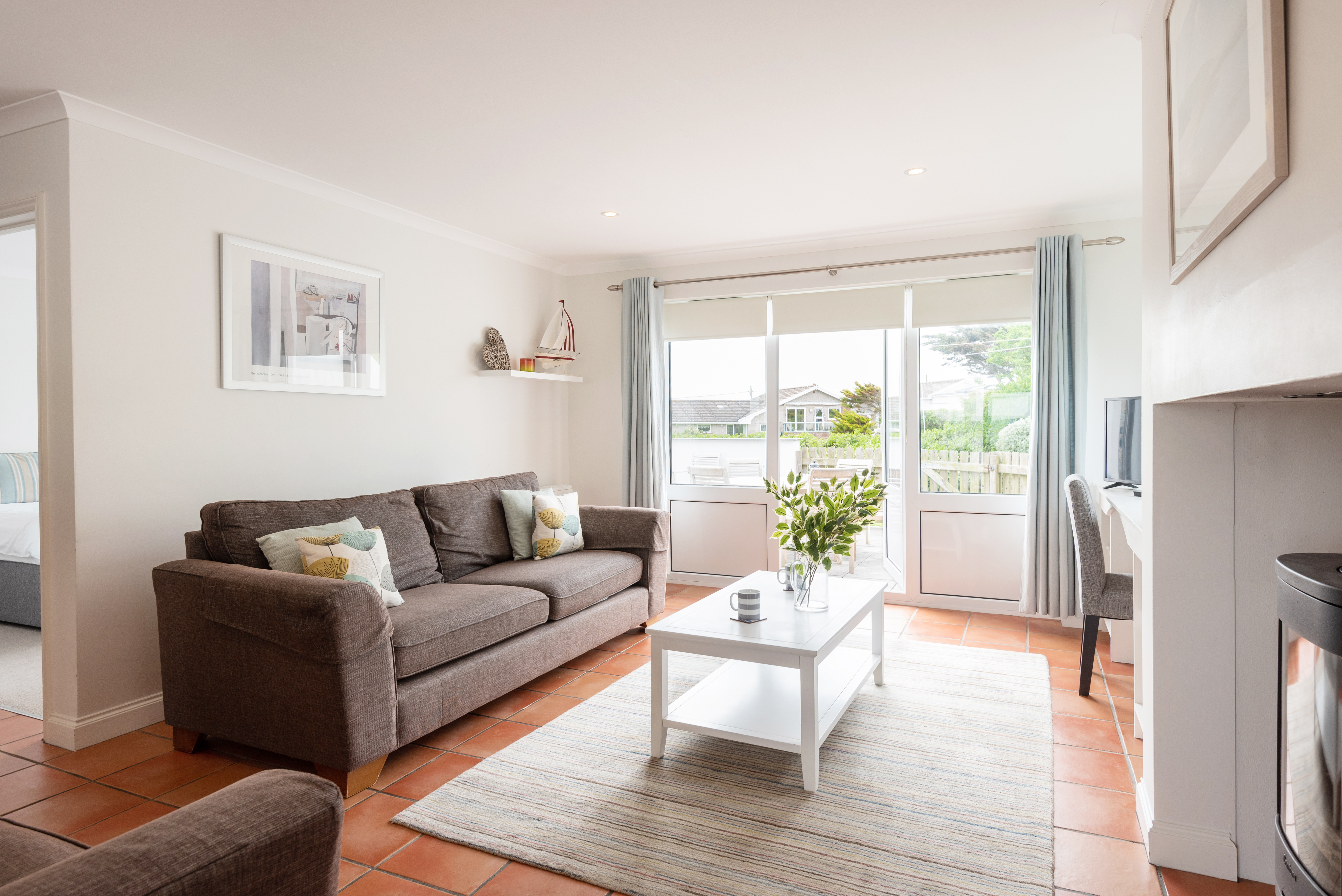 Sitting room: Smart TV, DVD player, modern log burner, sliding doors to gated patio.