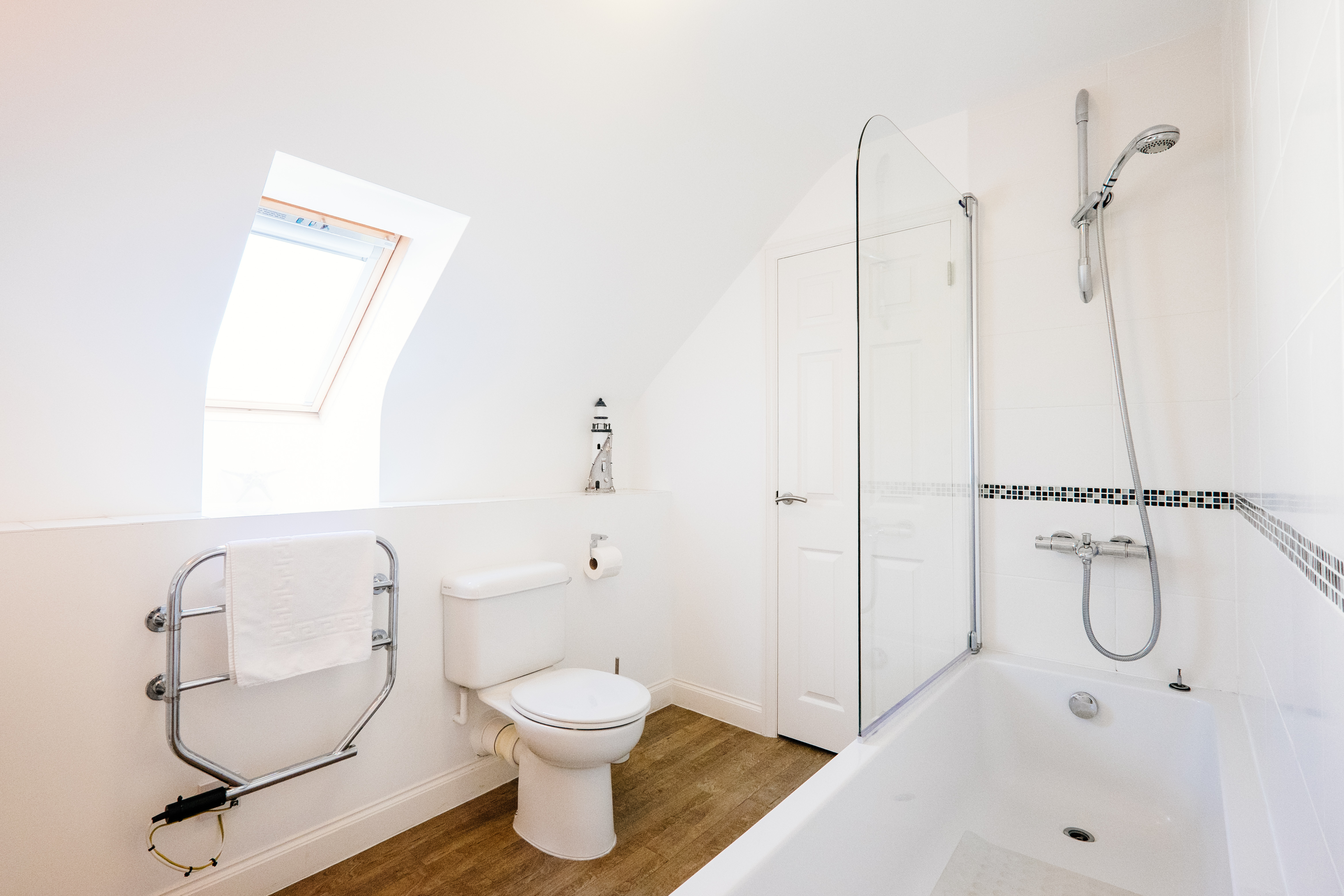 Bathroom: Bath with shower over, heated towel rail, basin, w.c.