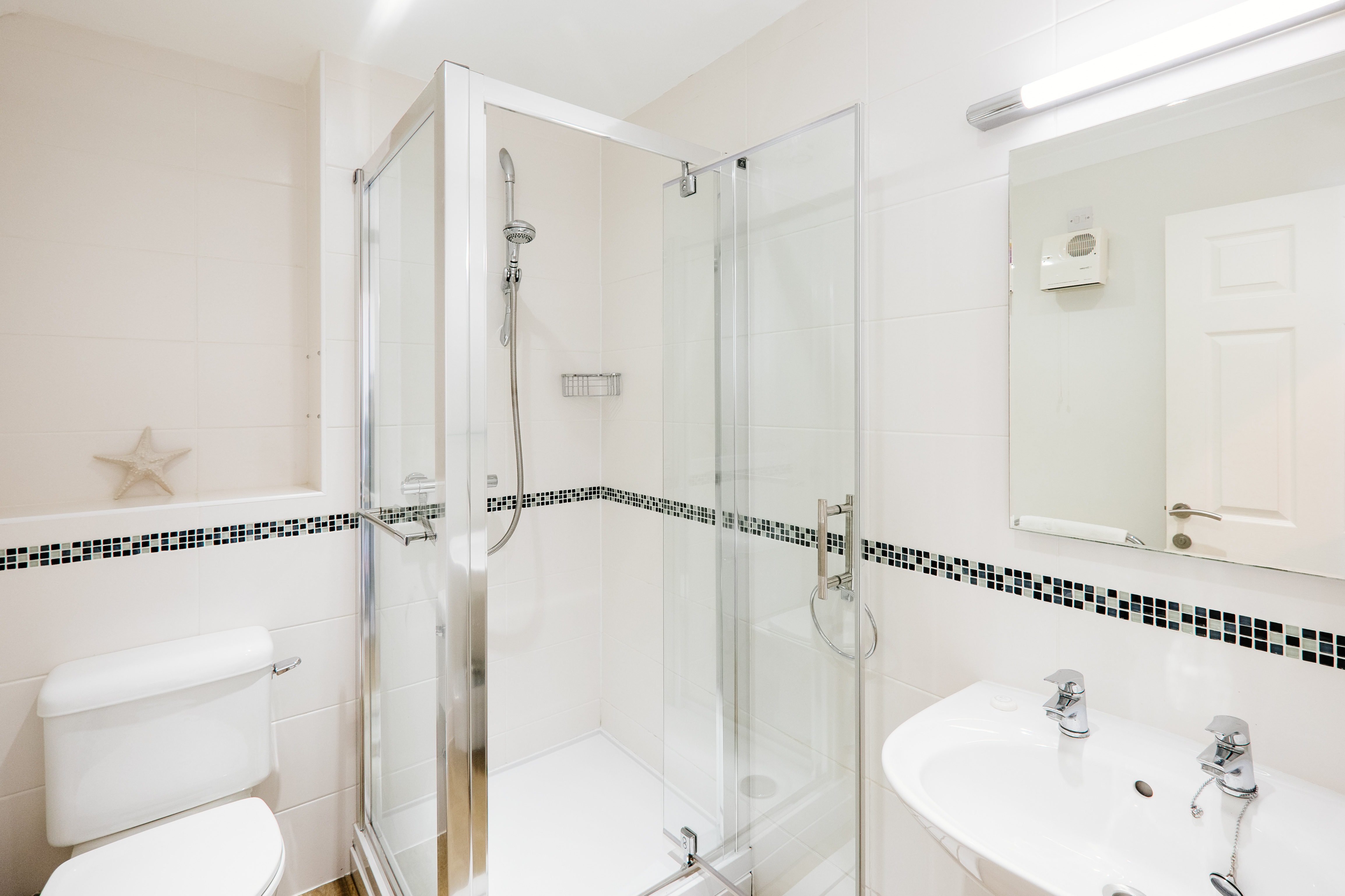Shower Room: Thermostatic shower, heated towel rail, basin, w.c.