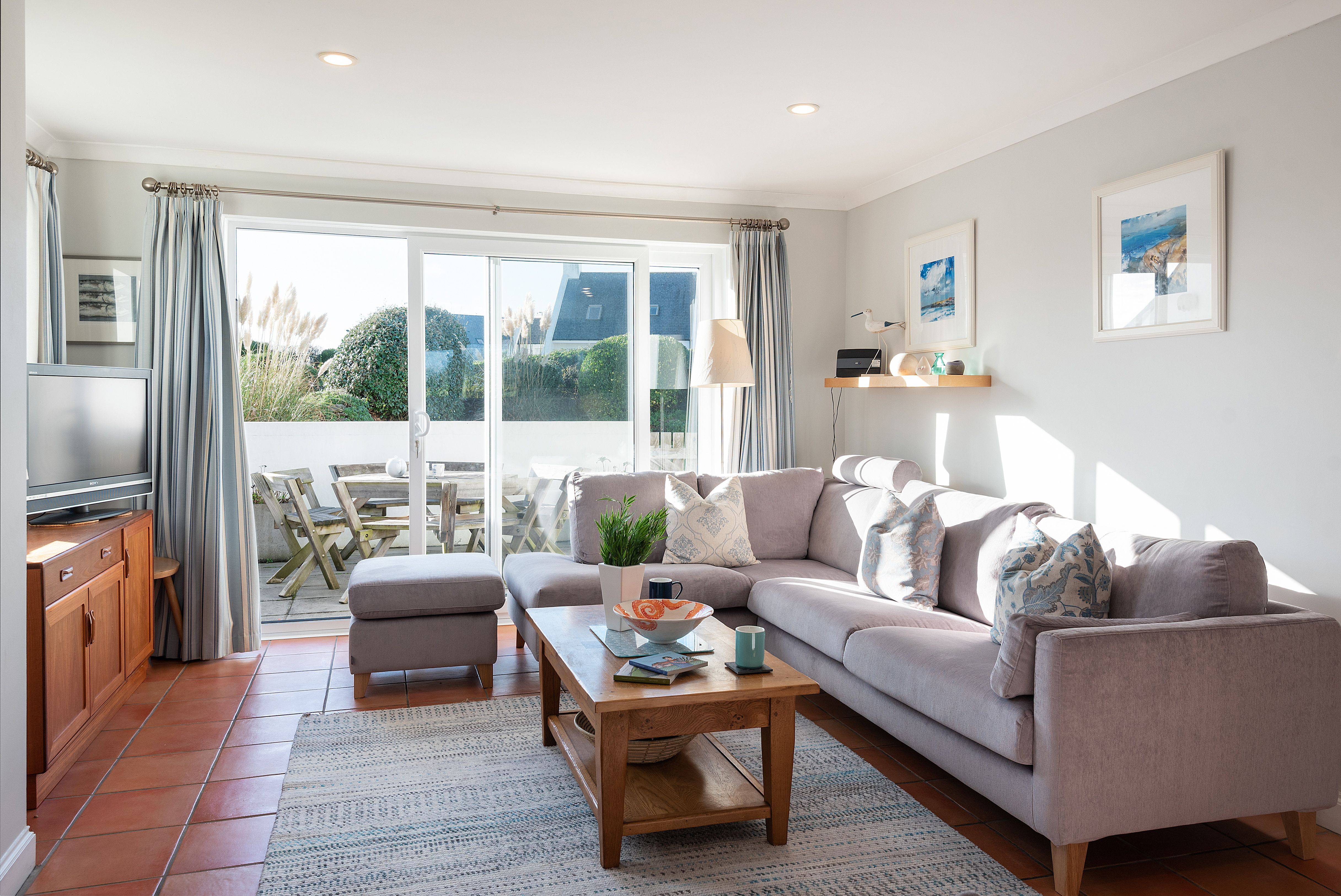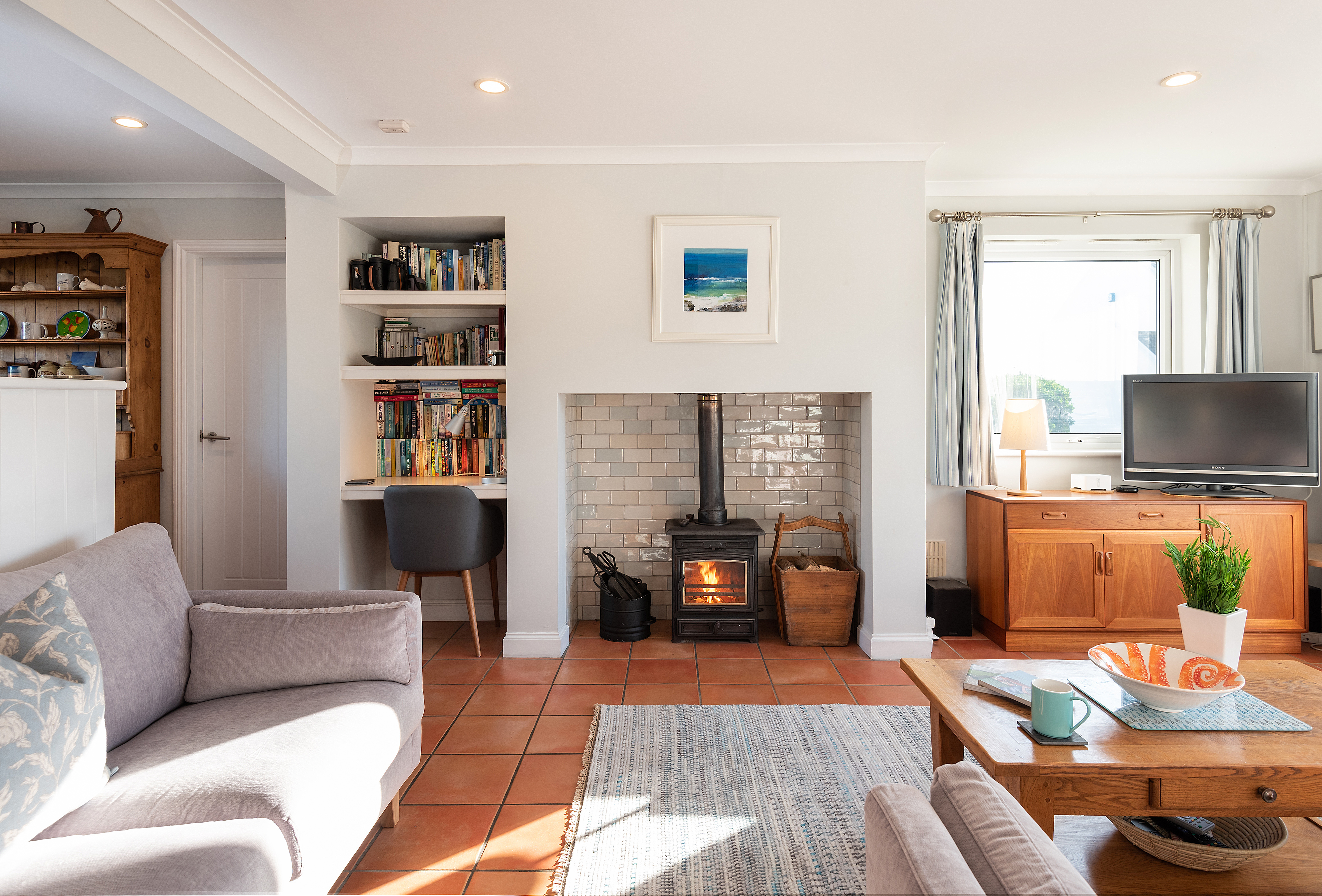Sitting Area: Smart TV, DVD player, Sonos wireless speaker, log burner, sliding doors to patio.