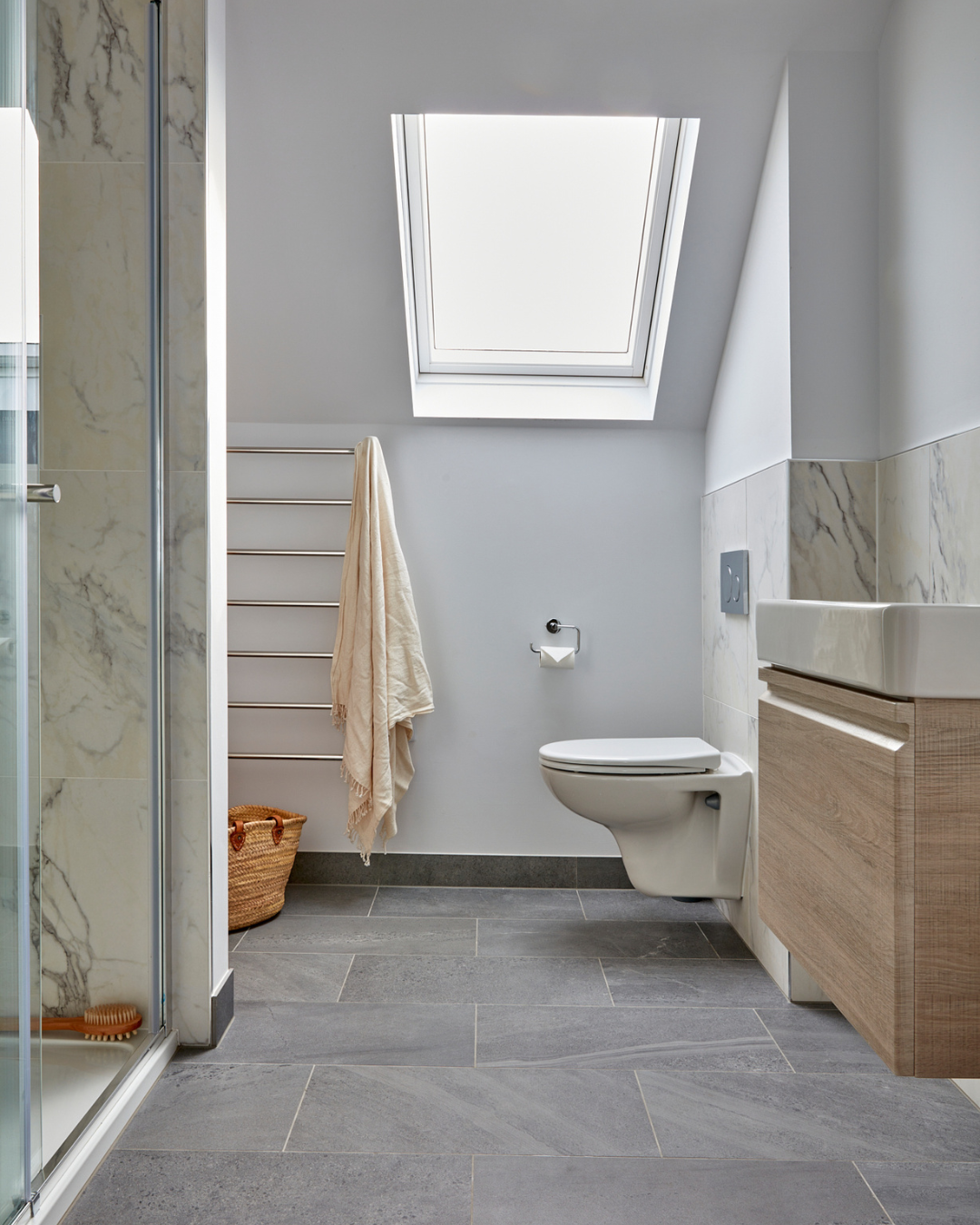 Family Bathroom: Shower, heated towel rail, basin & w.c.