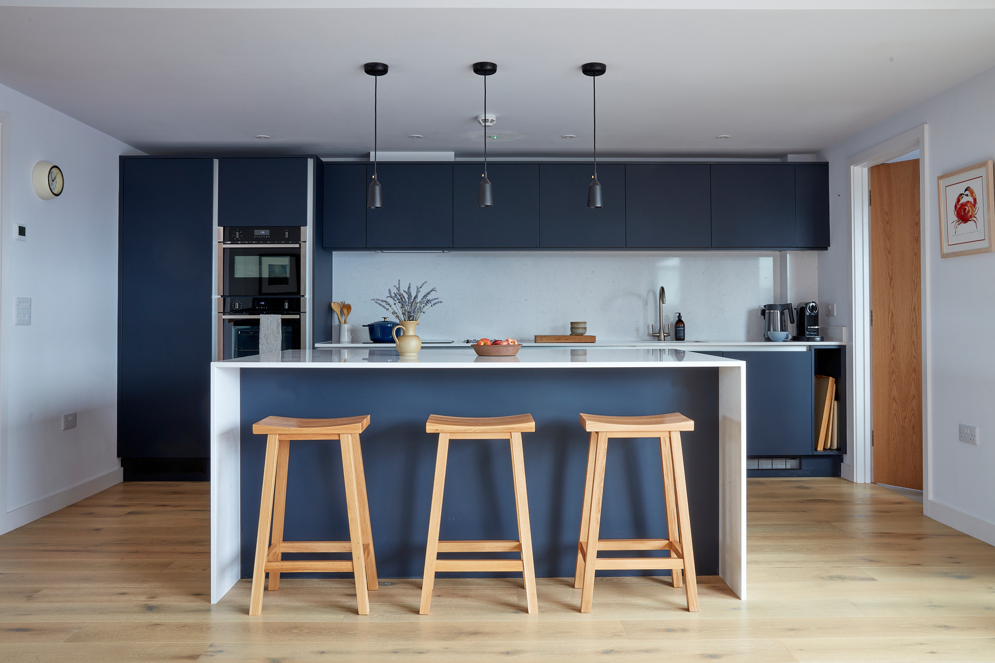 Kitchen: Kitchen island & breakfast bar. Double electric oven with a combination microwave, induction hob, larder fridge and separate under counter freezer, dishwasher, Nespresso coffee machine. Starter pack including oven gloves, tea towels, dishwasher tablets & cloths supplied.
