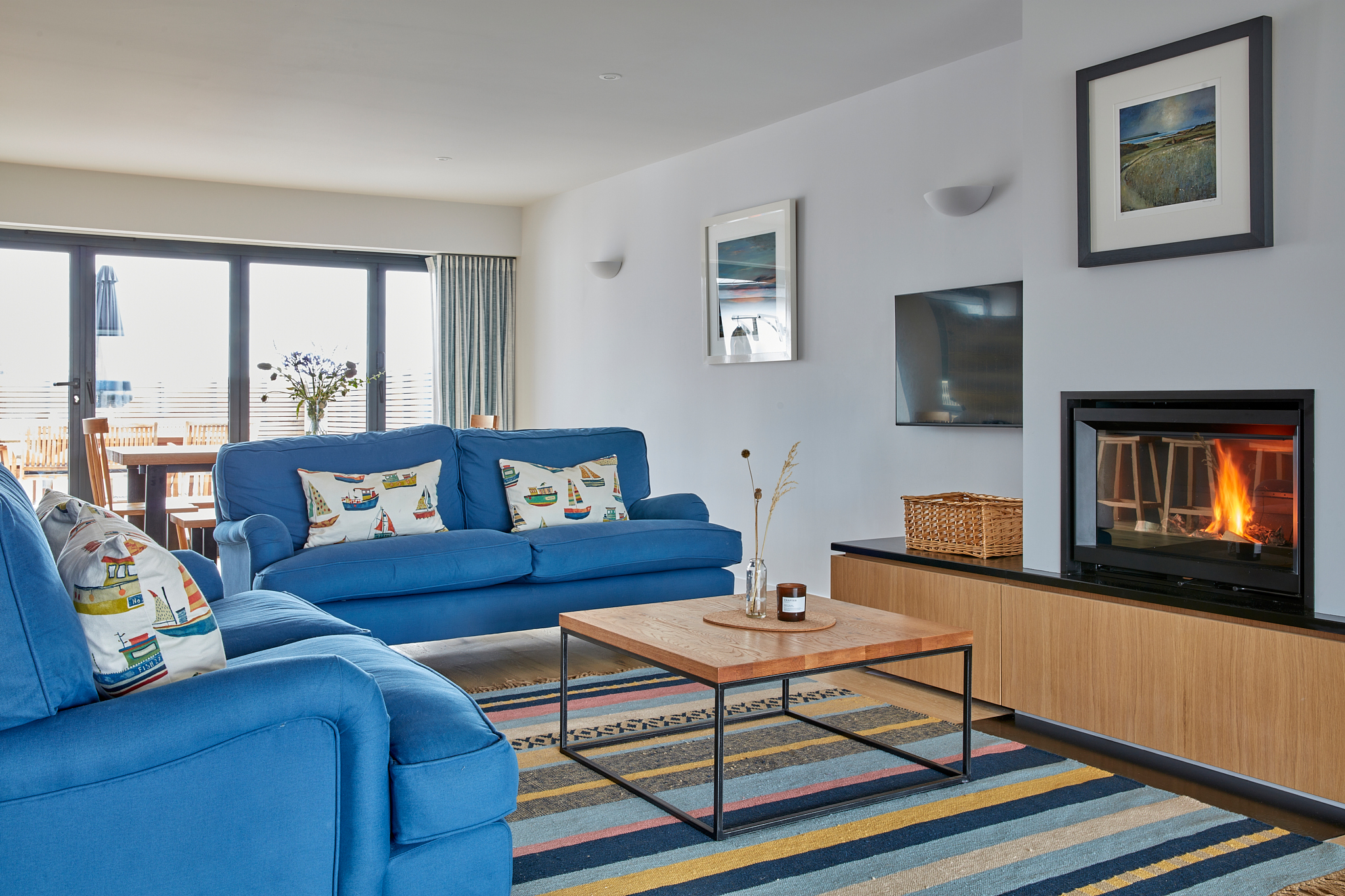 Sitting & Dining area: Smart TV, wood burner, dining table & chairs, bi-fold doors opening on to a spacious private terrace.