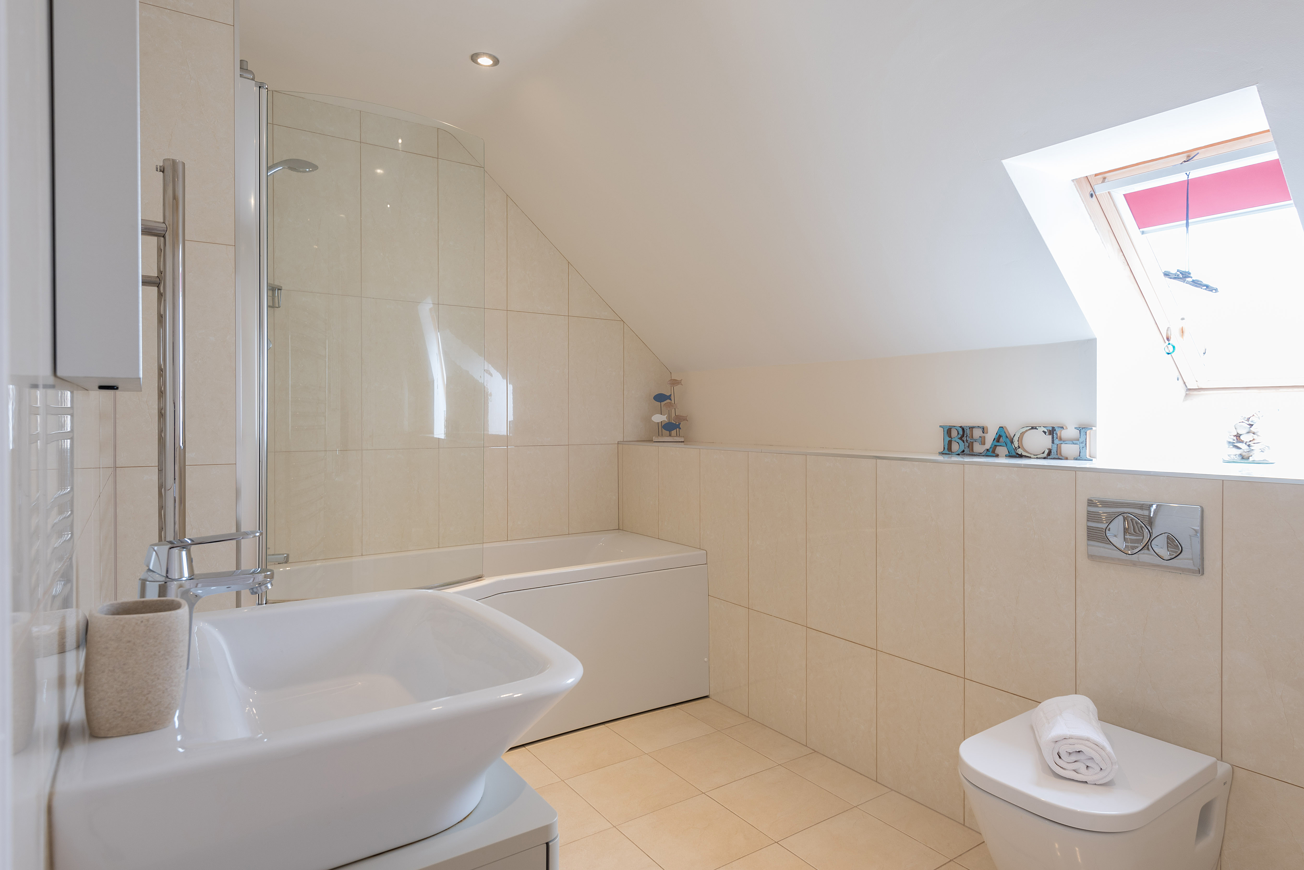 Family Bathroom: Bath with thermostatic shower over, heated towel rail, w.c.