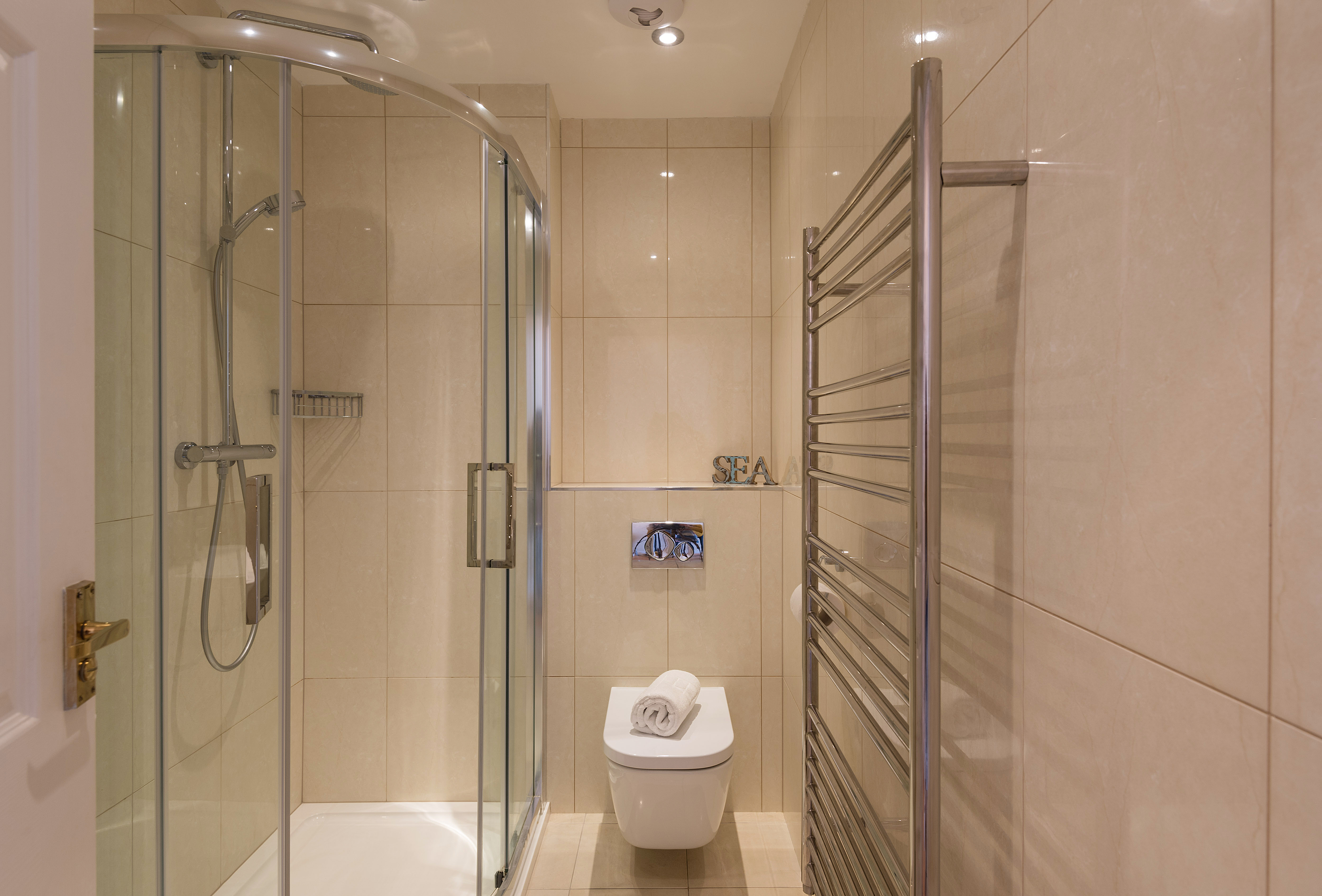 Shower Room: Thermostatic shower, heated towel rail, basin, w.c.
