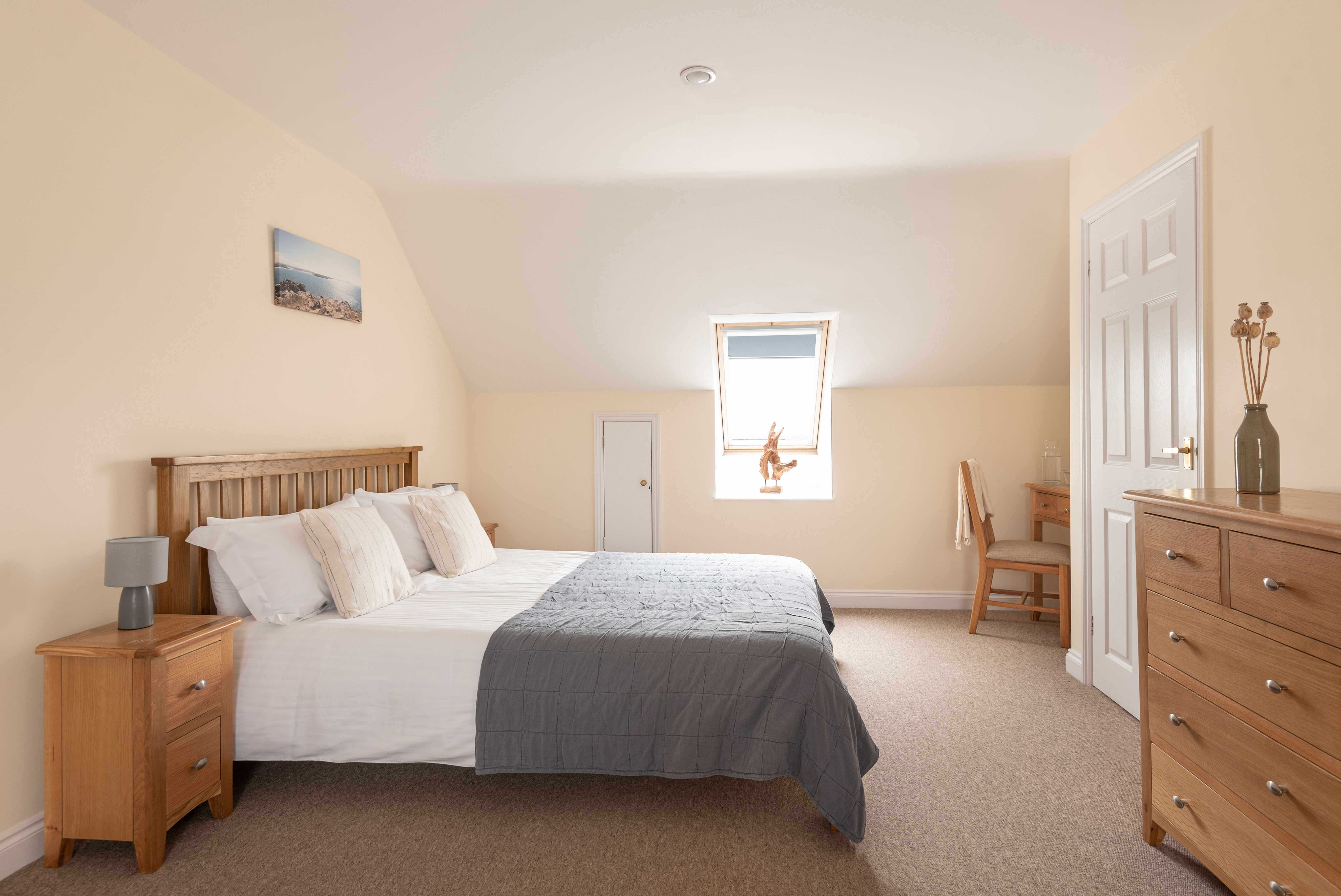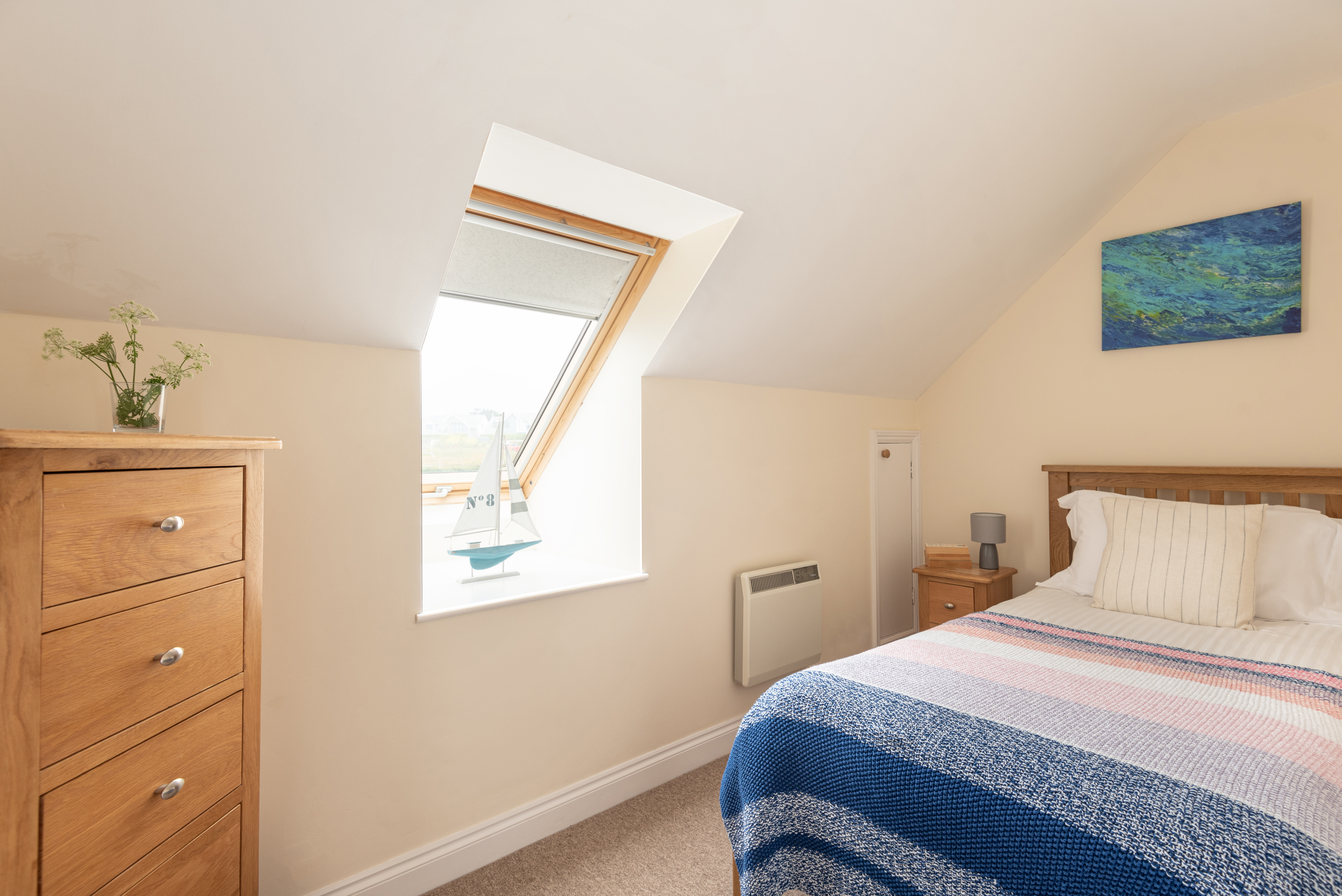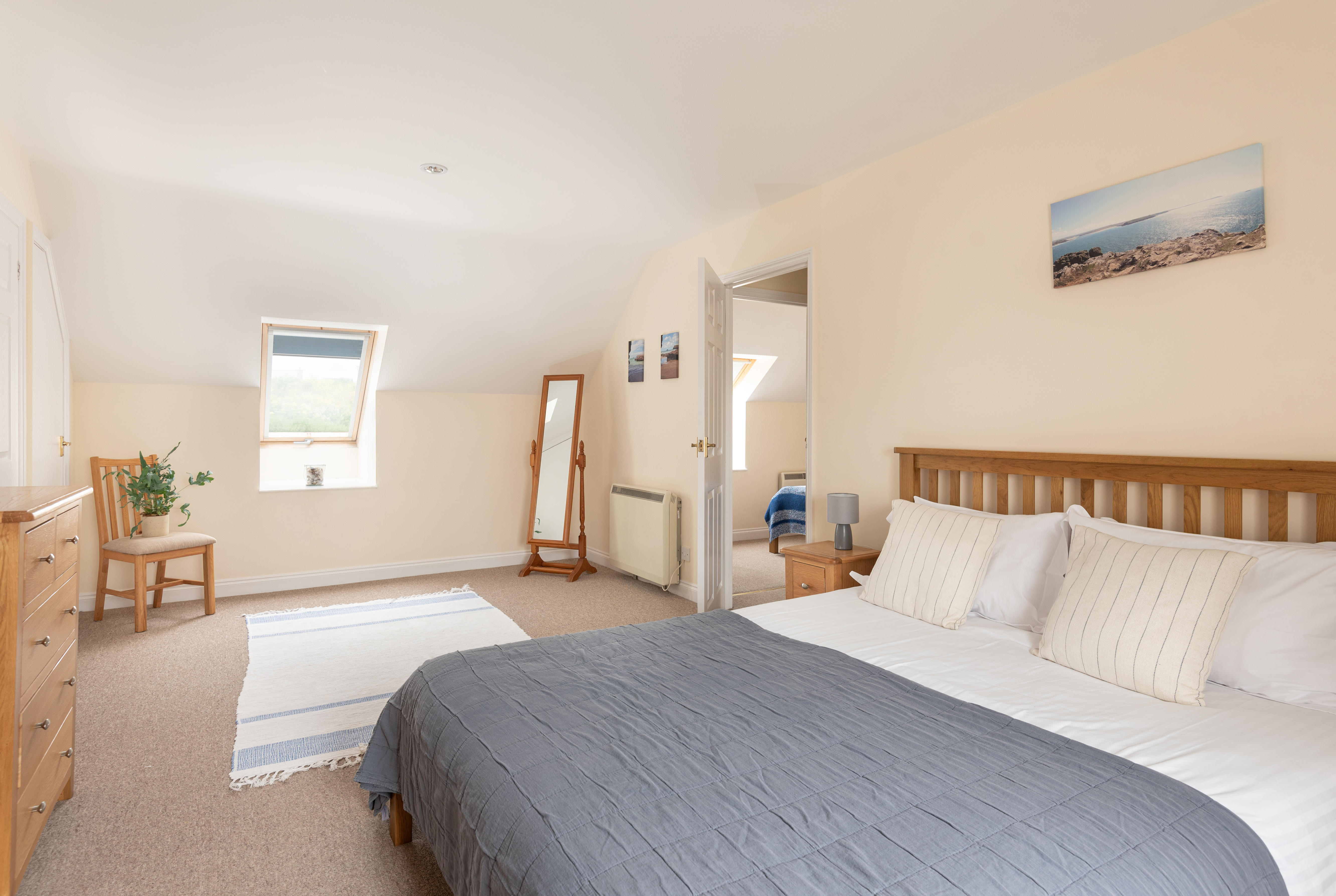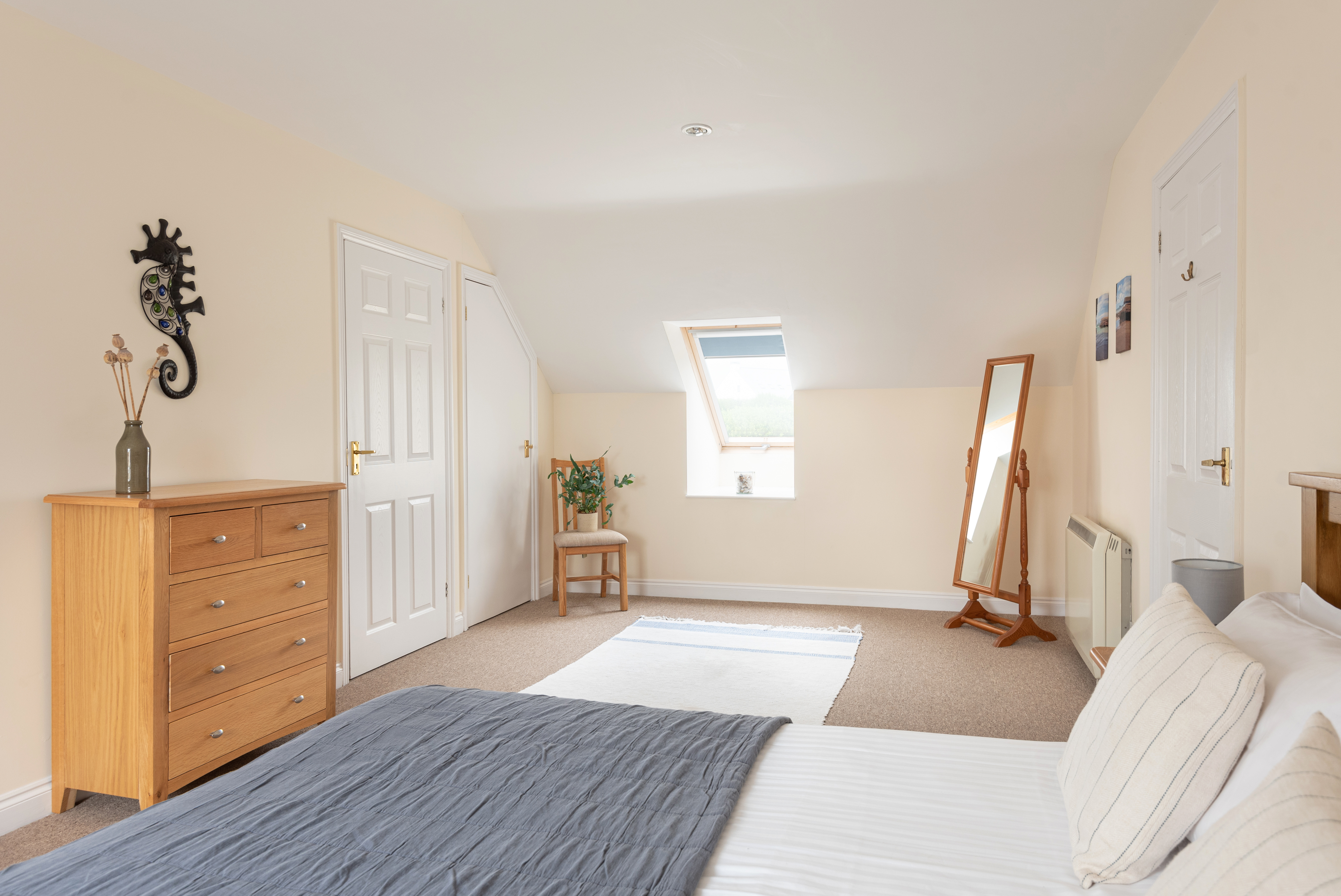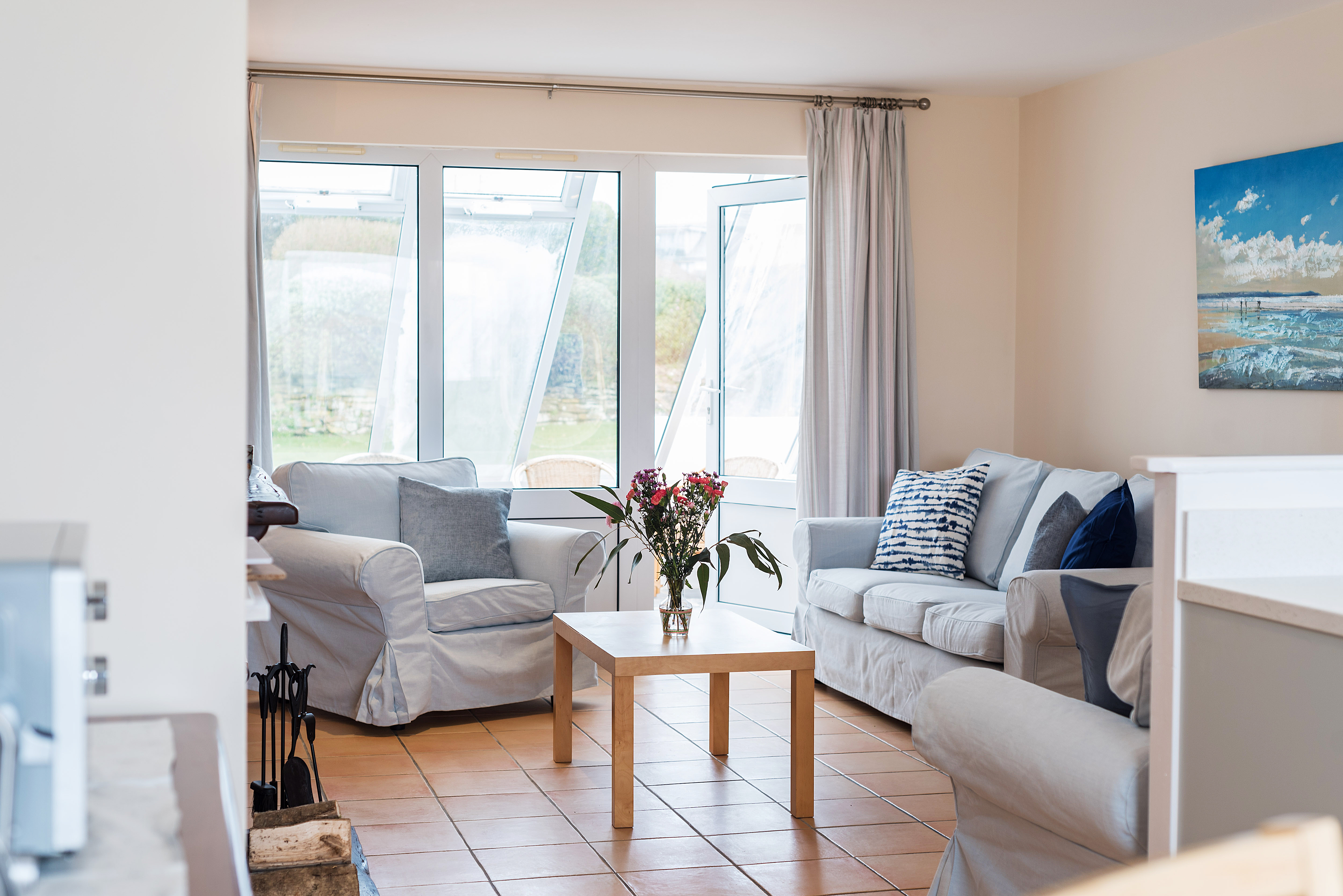 Inside, the open-plan living area features a modern kitchen and a log burner, creating a welcoming space to relax after a day outdoors. The spacious master bedroom provides a peaceful retreat, while the small conservatory at the back serves as a practical multi-purpose space - ideal for storing surfboards and beach gear.