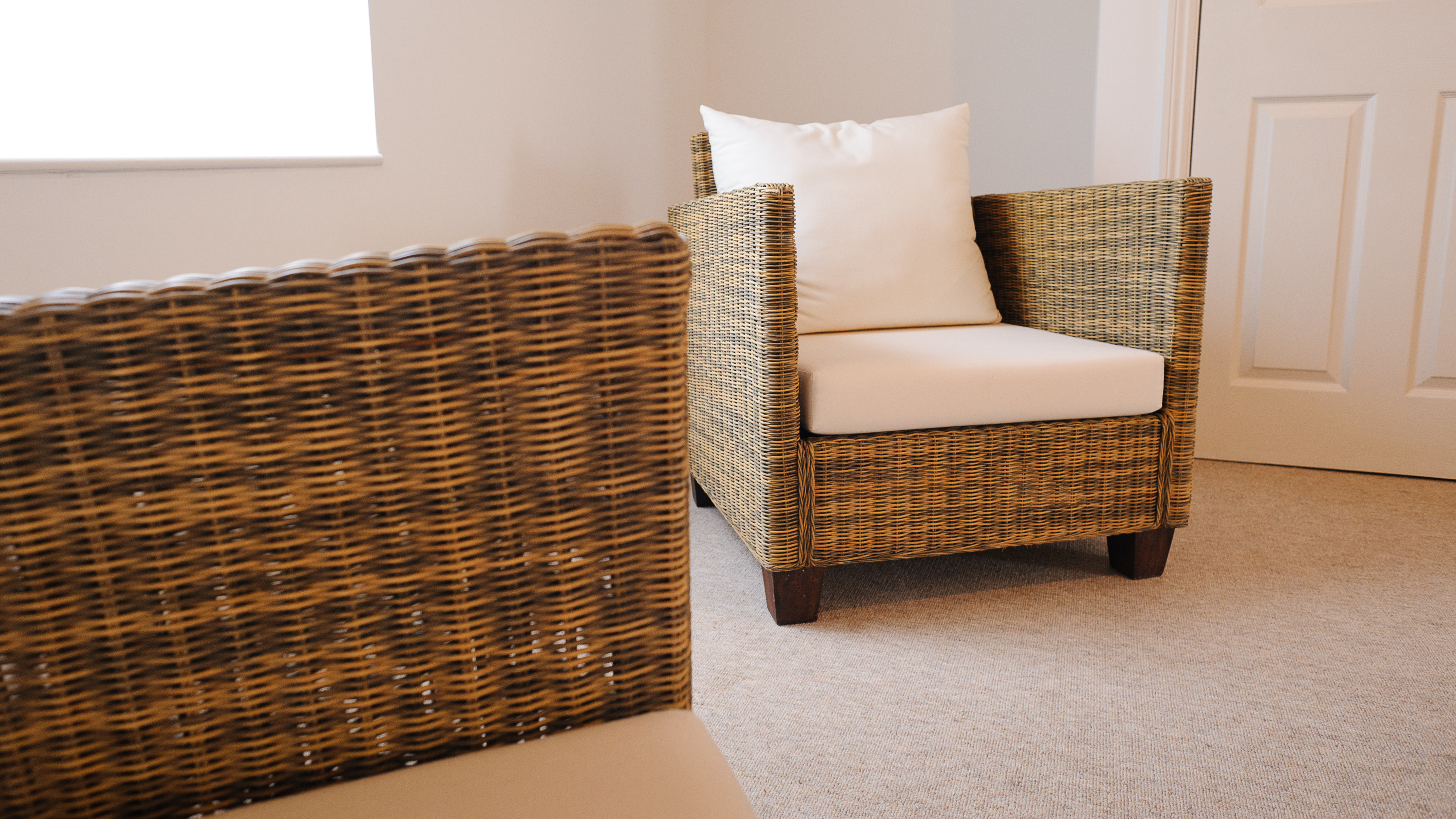 Bedroom 3: Master bedroom with king size (5’), ratan armchairs, wardrobe & chest drawers.
