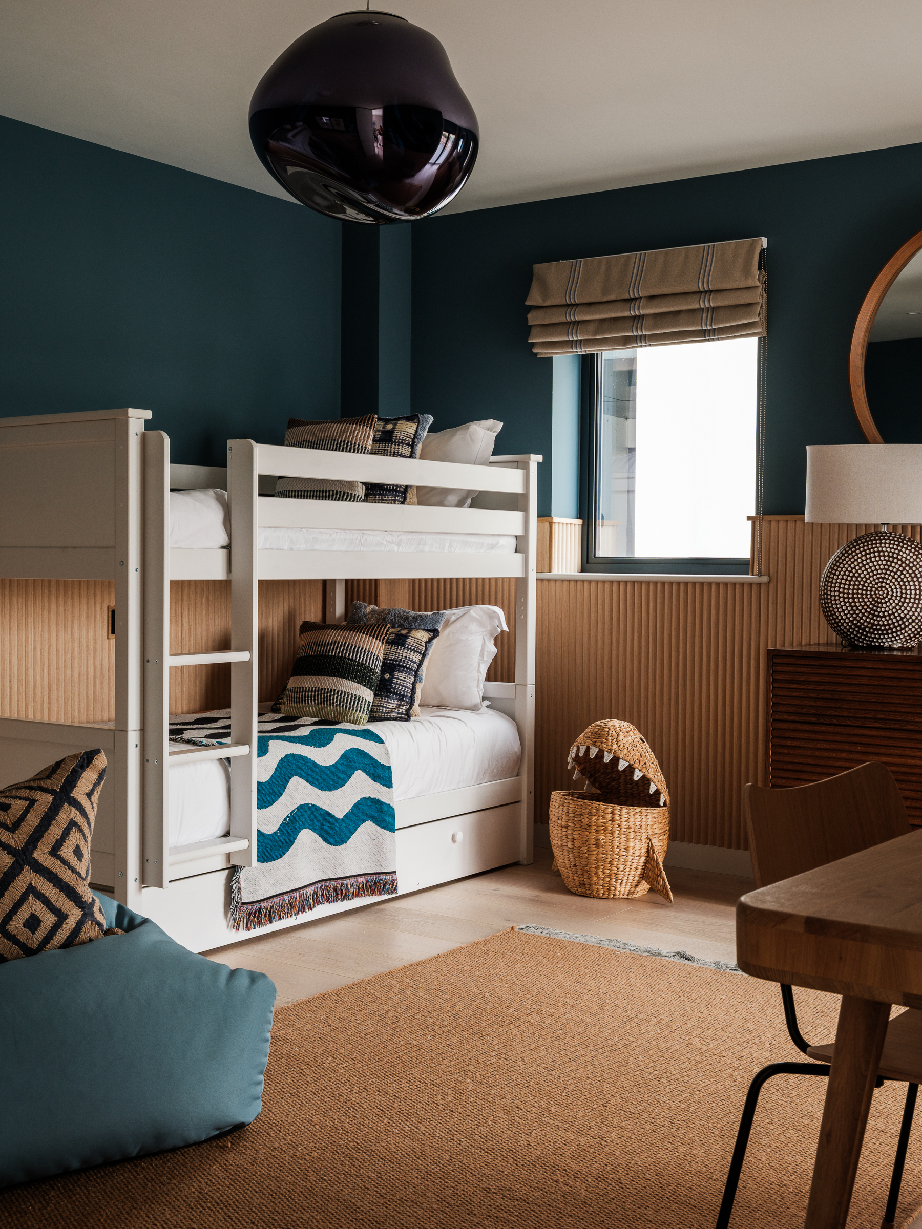 Bedroom 3: Bunk beds (3’) (suitable for children only) chest of drawers, desk, wall-mounted Smart T.V.